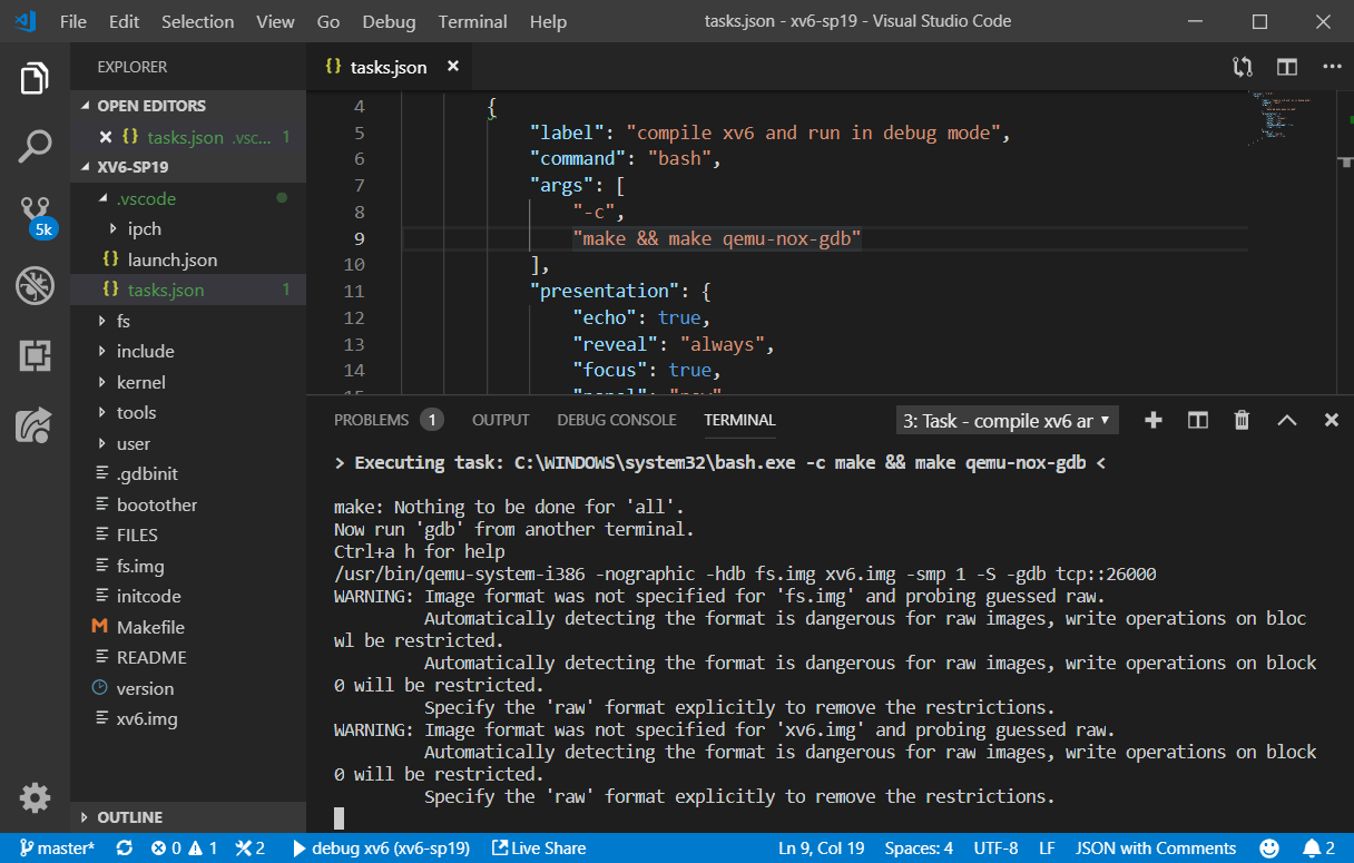 This file creates a default build task that compiles xv6 and runs it in debug mode.