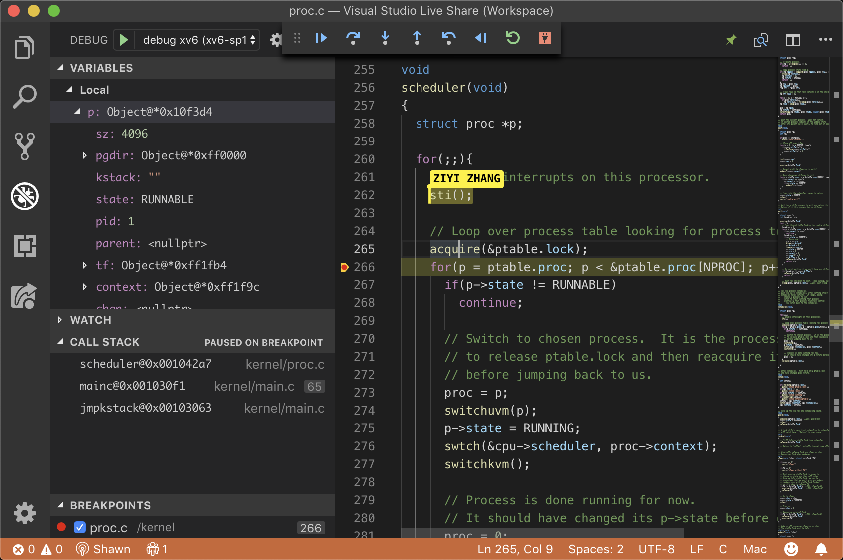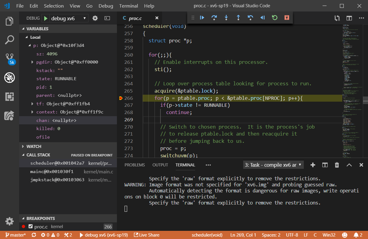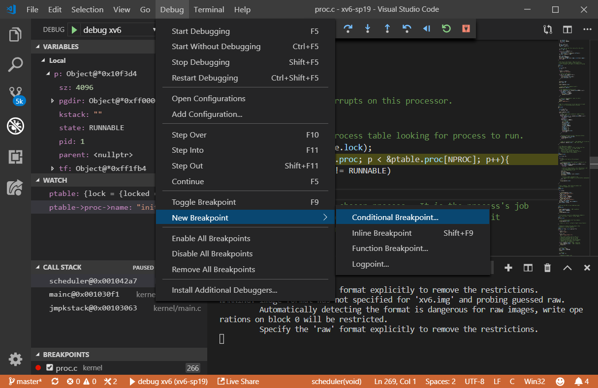 To test whether debugging is configured correctly, add a breakpoint at kernel/proc.c:266 by clicking the space left to the line number and press F5 for debugging (or open “Debug > Start Debugging” in the menu). You should be able to see the program stops at the specified line with variables and call stack shown at the left.