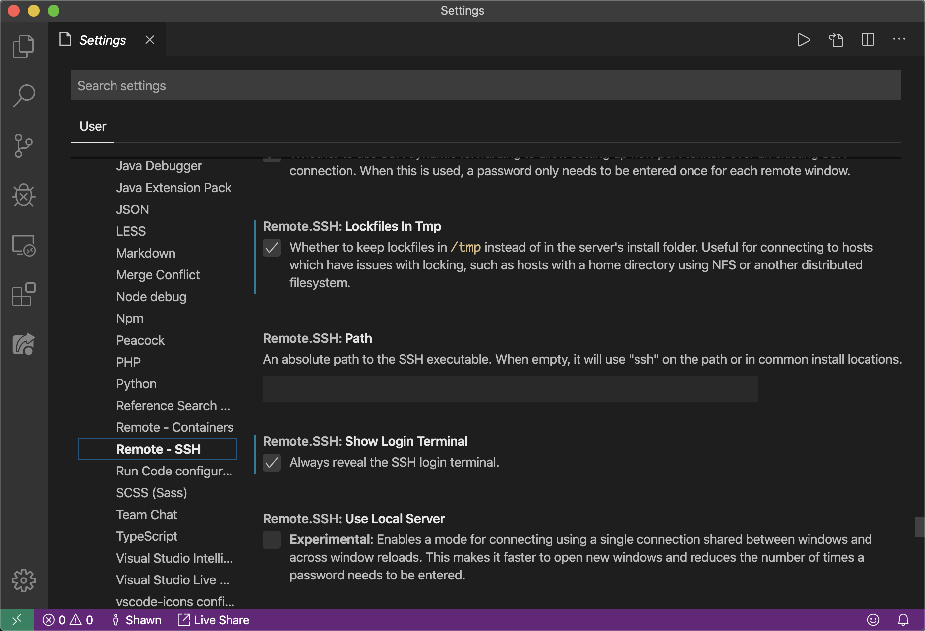 3. Open settings. Check the box for “Remote.SSH: Lockfiles In Tmp” and “Remote.SSH: Show Login Terminal” File locking does not work when the home directory is mounted from an AFS. Setting the path of lockfiles to /tmp solves the problem. For more detail, see https://github.com/microsoft/vscode-remote-release/issues/540 For the second setting, VS Code should automatically prompt you to enter the password, but I had some trouble seeing the prompt before. I suggest enabling this so the password is entered in the terminal like normal ssh.