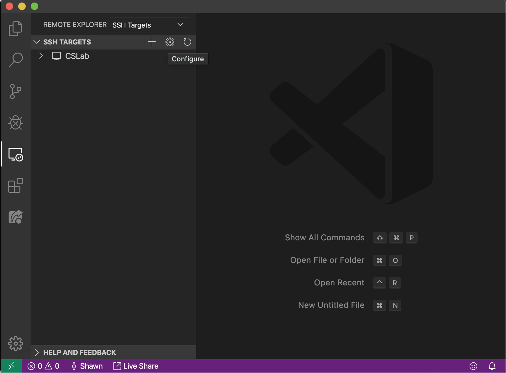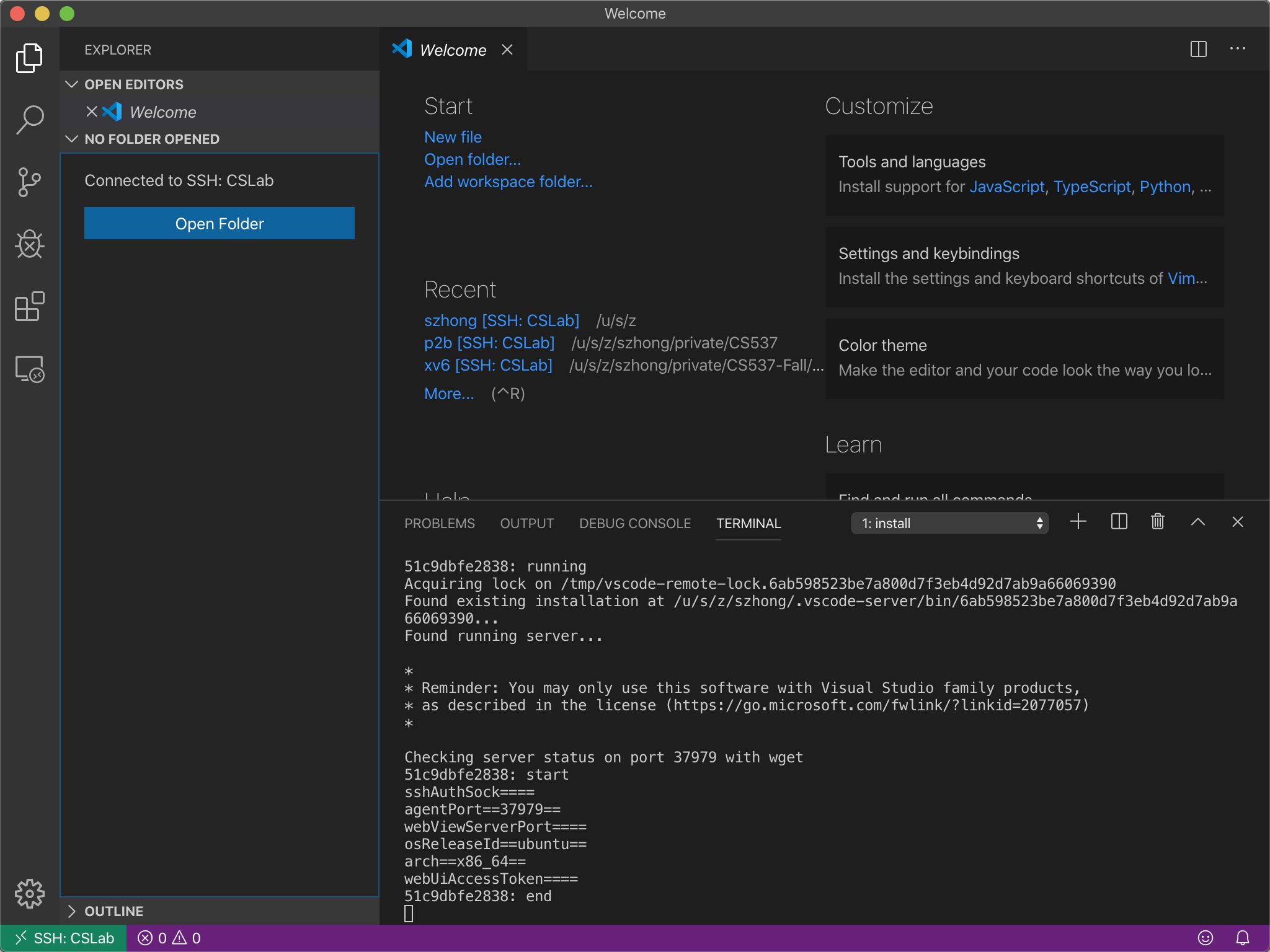 You can now remote SSH to the CS Lab by clicking the newly-added entry under “SSH TARGETS” A new VSCode windows will pop up with the bottom right corner showing “SSH: CSLab”