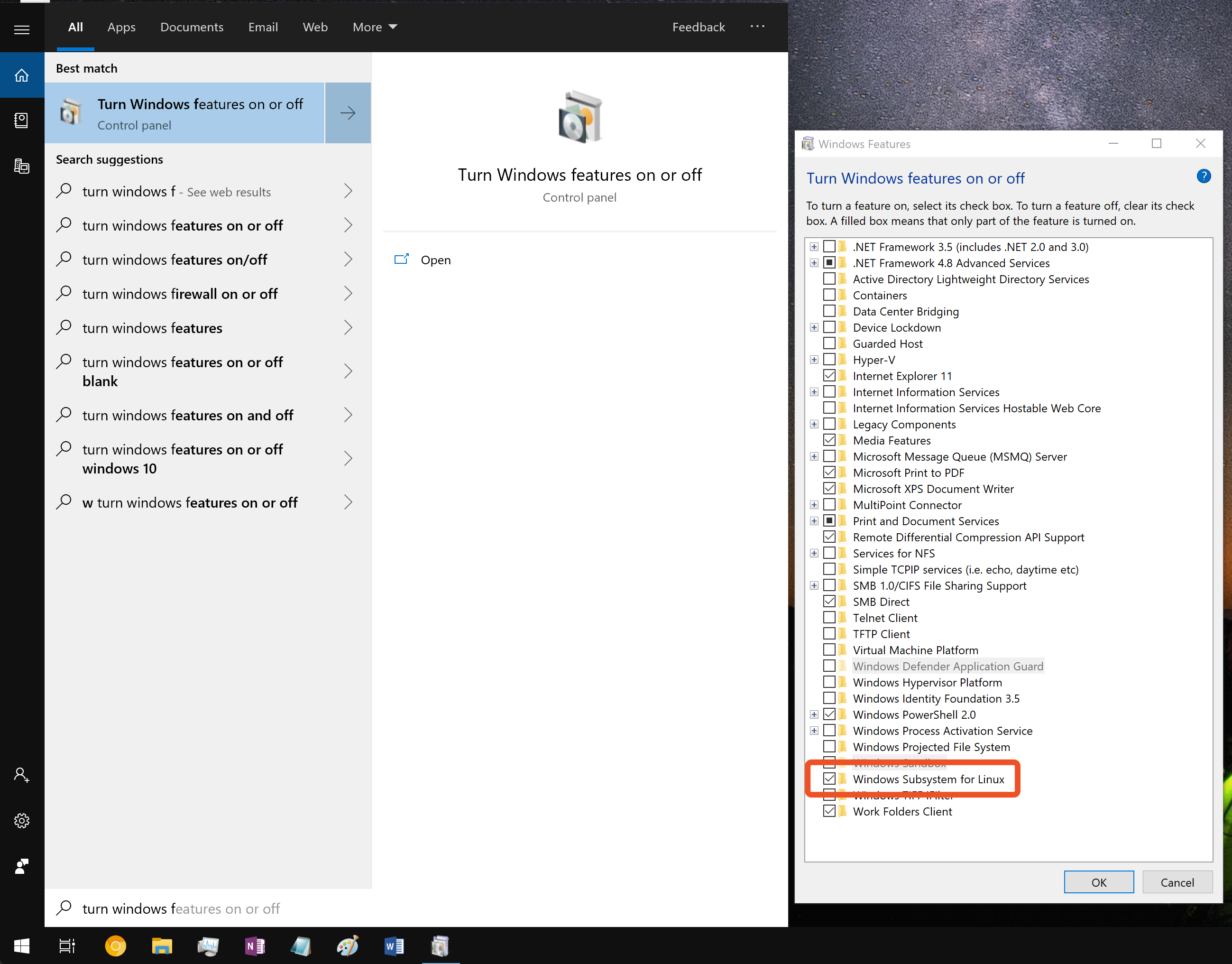 1. Search for “Turn Windows features on or off” in the start menu and open it. 2. Select “Windows Subsystem for Linux” 3. Restart your computer when prompted