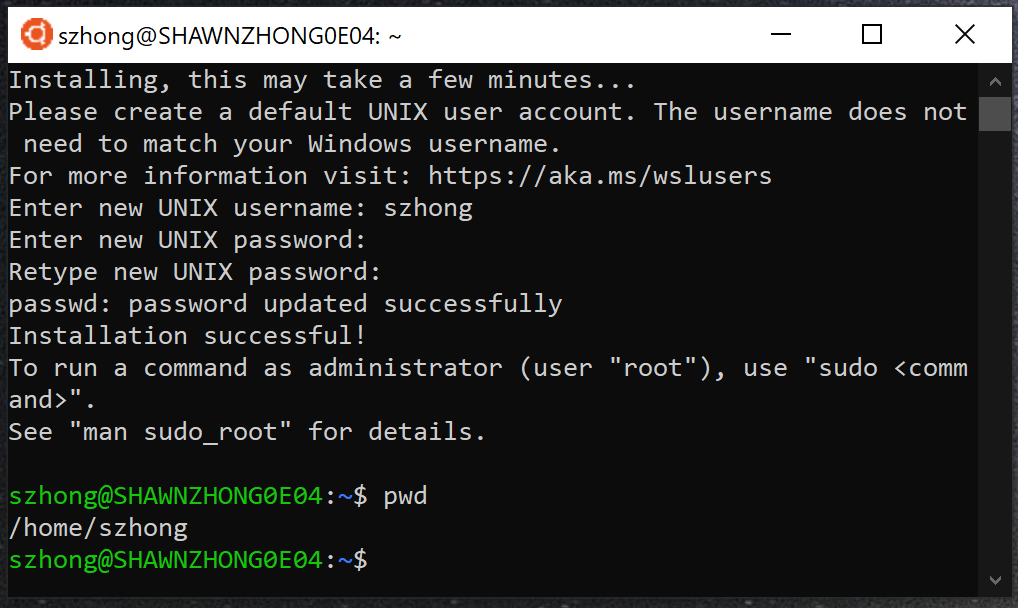 3. Once Ubuntu is downloaded, you should be able to see it in the Start Menu. Launch the program. It will take some time to set up the system for the first time. 4. After that, you will be prompted to create a new user for the subsystem. This does not need to match your Windows username or CS account. Once the account is created, you should be able to run the familiar Linux commands inside the subsystem.