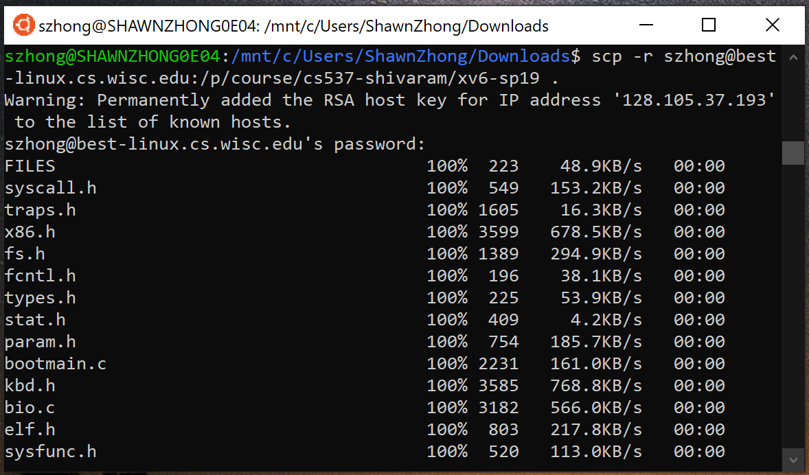 scp -r szhong@best-linux.cs.wisc.edu:/p/course/cs537-shivaram/xv6-sp19 .