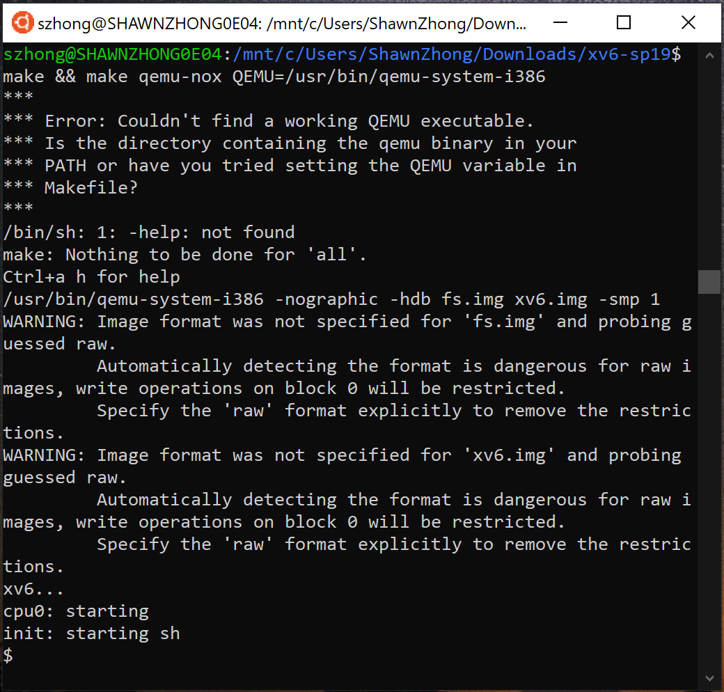 Congratulations! You have xv6 running locally on your Windows machine. Since everything is on your local computer, you don’t need to sync the files to the server anymore! It also makes the debug experience much better since the debugging port is open on your local computer (i.e., no more port forwarding).