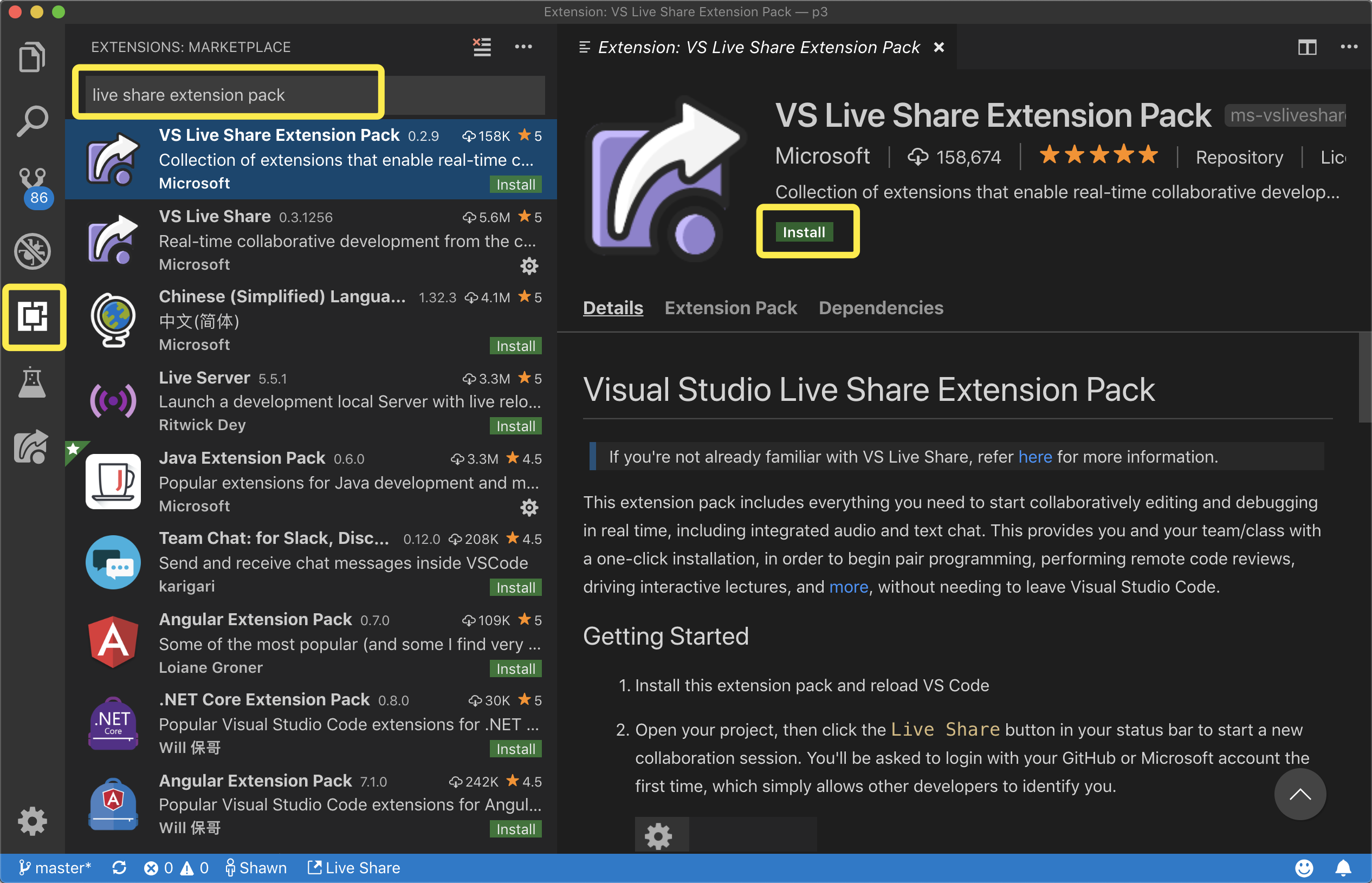 3. Open the extension tab on the left, search for VS Live Share Extension Pack, and click install. Restart the editor if prompted.