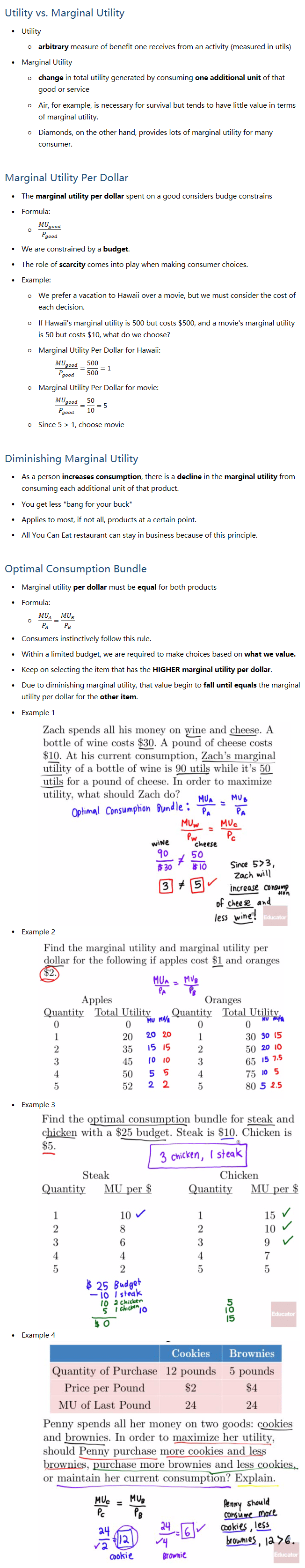 Utility vs. Marginal Utility • Utility ○ arbitrary measure of benefit one receives from an activity (measured in utils) • Marginal Utility ○ change in total utility generated by consuming one additional unit of that good or service ○ Air, for example, is necessary for survival but tends to have little value in terms of marginal utility. ○ Diamonds, on the other hand, provides lots of marginal utility for many consumer. Marginal Utility Per Dollar • The marginal utility per dollar spent on a good considers budge constrains • Formula: ○ 〖MU〗_good/P_good • We are constrained by a budget. • The role of scarcity comes into play when making consumer choices. • Example: ○ We prefer a vacation to Hawaii over a movie, but we must consider the cost of each decision. ○ If Hawaii’s marginal utility is 500 but costs $500, and a movie’s marginal utility is 50 but costs $10, what do we choose? ○ Marginal Utility Per Dollar for Hawaii: 〖MU〗_good/P_good =500/500=1 ○ Marginal Utility Per Dollar for movie: 〖MU〗_good/P_good =50/10=5 ○ Since 5 1, choose movie Diminishing Marginal Utility • As a person increases consumption, there is a decline in the marginal utility from consuming each additional unit of that product. • You get less