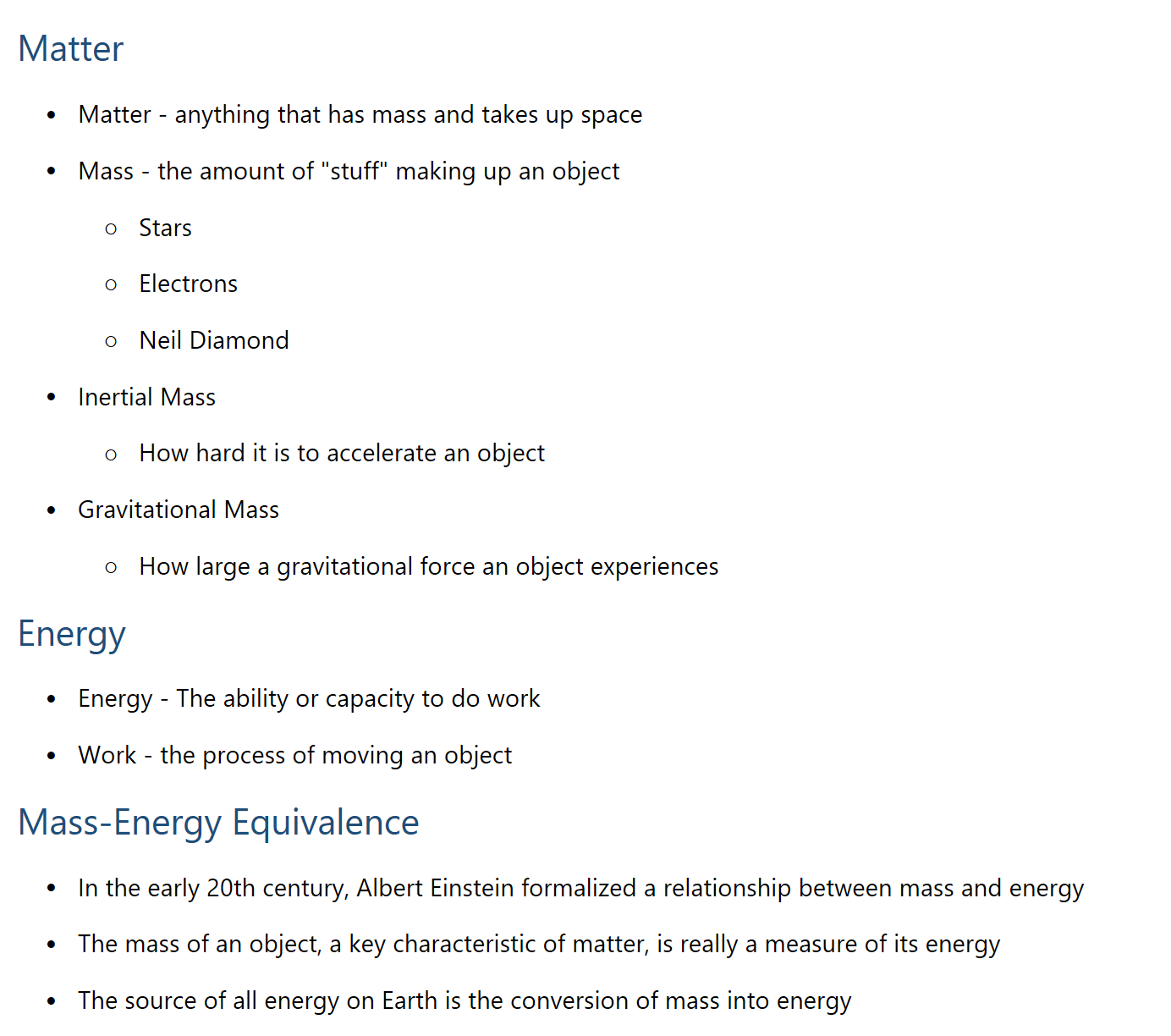 Matter • Matter - anything that has mass and takes up space • Mass - the amount of “stuff” making up an object ○ Stars ○ Electrons ○ Neil Diamond • Inertial Mass ○ How hard it is to accelerate an object • Gravitational Mass ○ How large a gravitational force an object experiences Energy • Energy - The ability or capacity to do work • Work - the process of moving an object Mass-Energy Equivalence • In the early 20th century, Albert Einstein formalized a relationship between mass and energy • The mass of an object, a key characteristic of matter, is really a measure of its energy • The source of all energy on Earth is the conversion of mass into energy