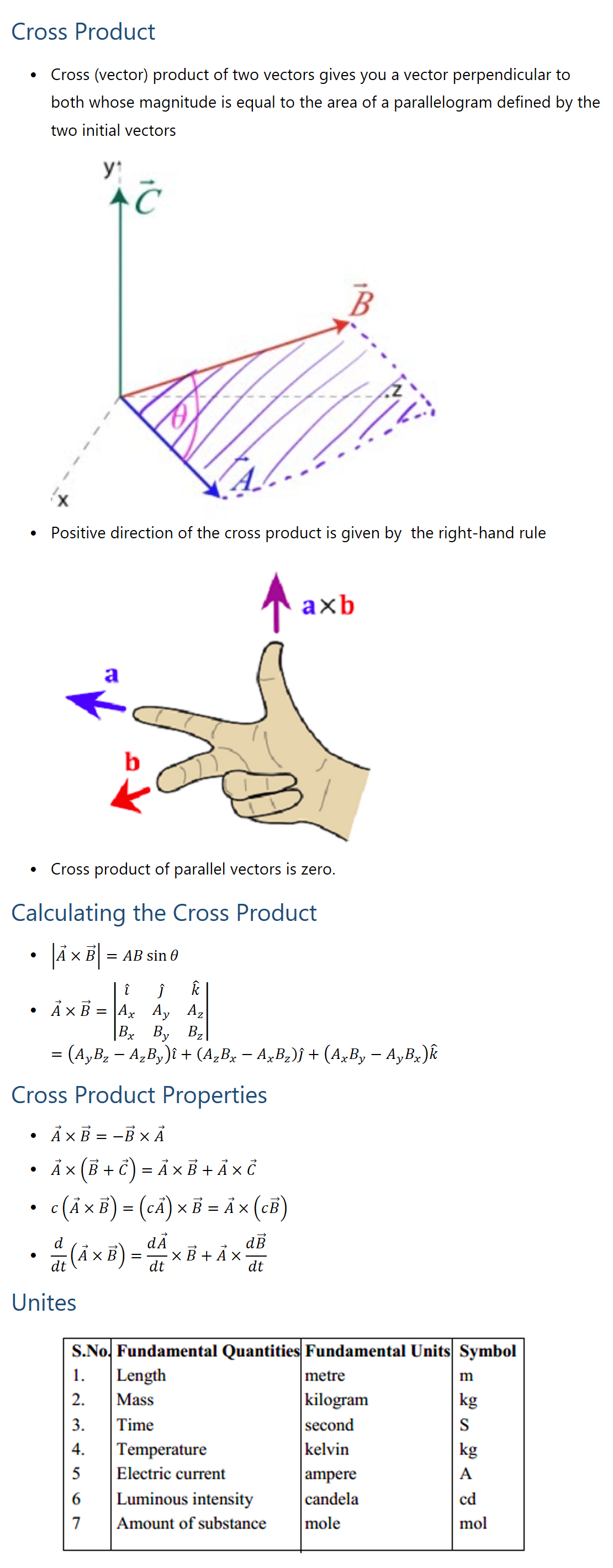 Cross Product • Cross (vector) product of two vectors gives you a vector perpendicular to both whose magnitude is equal to the area of a parallelogram defined by the two initial vectors • Positive direction of the cross product is given by the right-hand rule • Cross product of parallel vectors is zero. Calculating the Cross Product • |A ⃗×B ⃗ |=AB sinθ • A ⃗×B ⃗=|■8(i ̂&j ̂&k ̂@A_x&A_y&A_z@B_x&B_y&B_z )|=(A_y B_z−A_z B_y ) i ̂+(A_z B_x−A_x B_z ) j ̂+(A_x B_y−A_y B_x ) k ̂ Cross Product Properties • A ⃗×B ⃗=−B ⃗×A ⃗ • A ⃗×(B ⃗+C ⃗ )=A ⃗×B ⃗+A ⃗×C ⃗ • c(A ⃗×B ⃗ )=(cA ⃗ )×B ⃗=A ⃗×(cB ⃗ ) • d/dt (A ⃗×B ⃗ )=(dA ⃗)/dt×B ⃗+A ⃗×(dB ⃗)/dt Unites