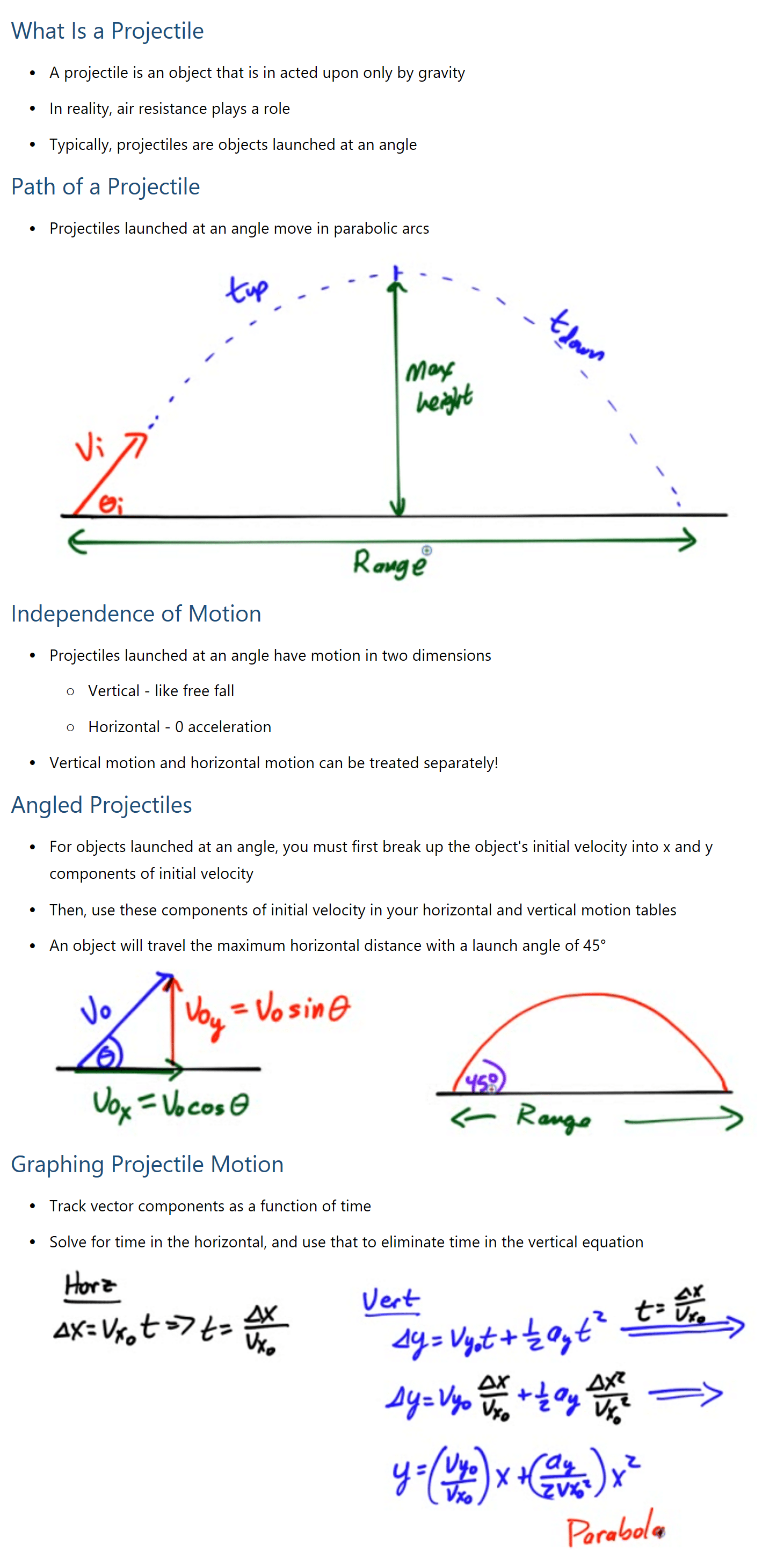 What Is a Projectile • A projectile is an object that is in acted upon only by gravity • In reality, air resistance plays a role • Typically, projectiles are objects launched at an angle Path of a Projectile • Projectiles launched at an angle move in parabolic arcs Independence of Motion • Projectiles launched at an angle have motion in two dimensions ○ Vertical - like free fall ○ Horizontal - 0 acceleration • Vertical motion and horizontal motion can be treated separately! Angled Projectiles • For objects launched at an angle, you must first break up the object