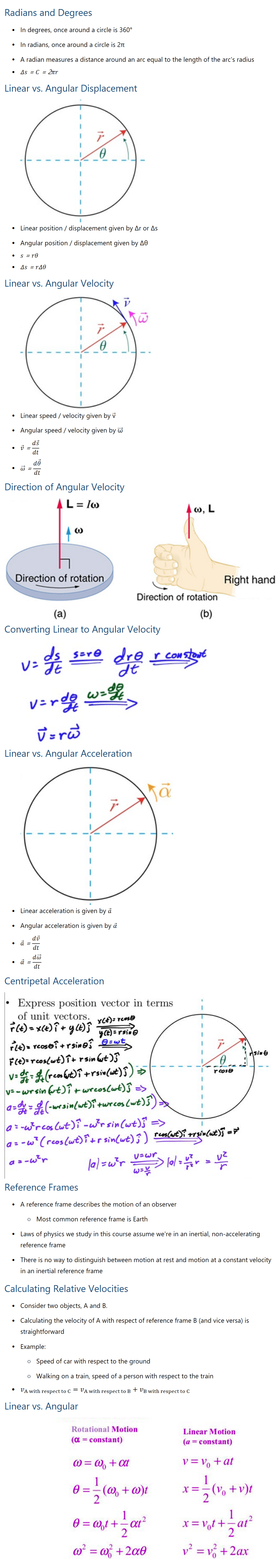 Radians and Degrees • In degrees, once around a circle is 360° • In radians, once around a circle is 2π • A radian measures a distance around an arc equal to the length of the arcs radius • Δs=C=2πr Linear vs. Angular Displacement • Linear position / displacement given by Δr or Δs • Angular position / displacement given by Δθ • s=rθ • Δs=rΔθ Linear vs. Angular Velocity • Linear speed / velocity given by v ⃗ • Angular speed / velocity given by ω ⃗ • v ⃗=(ds ⃗)/dt • ω ⃗=(dθ ⃗)/dt Direction of Angular Velocity Converting Linear to Angular Velocity Linear vs. Angular Acceleration • Linear acceleration is given by a ⃗ • Angular acceleration is given by α ⃗ • a ⃗=(dv ⃗)/dt • α ⃗=(dω ⃗)/dt Centripetal Acceleration Reference Frames • A reference frame describes the motion of an observer ○ Most common reference frame is Earth • Laws of physics we study in this course assume were in an inertial, non-accelerating reference frame • There is no way to distinguish between motion at rest and motion at a constant velocity in an inertial reference frame Calculating Relative Velocities • Consider two objects, A and B. • Calculating the velocity of A with respect of reference frame B (and vice versa) is straightforward • Example: ○ Speed of car with respect to the ground ○ Walking on a train, speed of a person with respect to the train • v_(A with respect to C)=v_(A with respect to B)+v_(B with respect to C) Linear vs. Angular