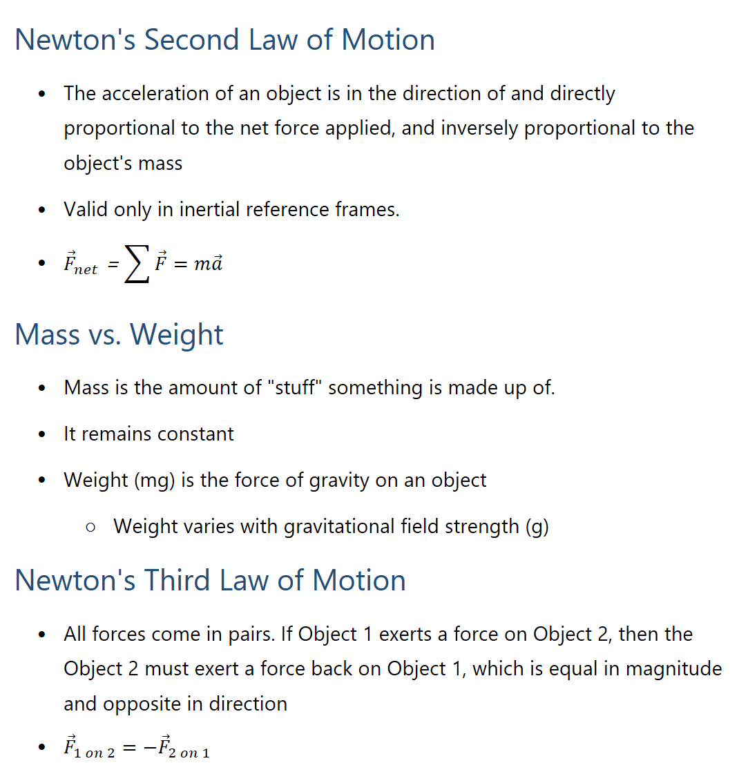 Newtons Second Law of Motion • The acceleration of an object is in the direction of and directly proportional to the net force applied, and inversely proportional to the objects mass • Valid only in inertial reference frames. • F ⃗_net=∑▒F ⃗ =ma ⃗ Mass vs. Weight • Mass is the amount of