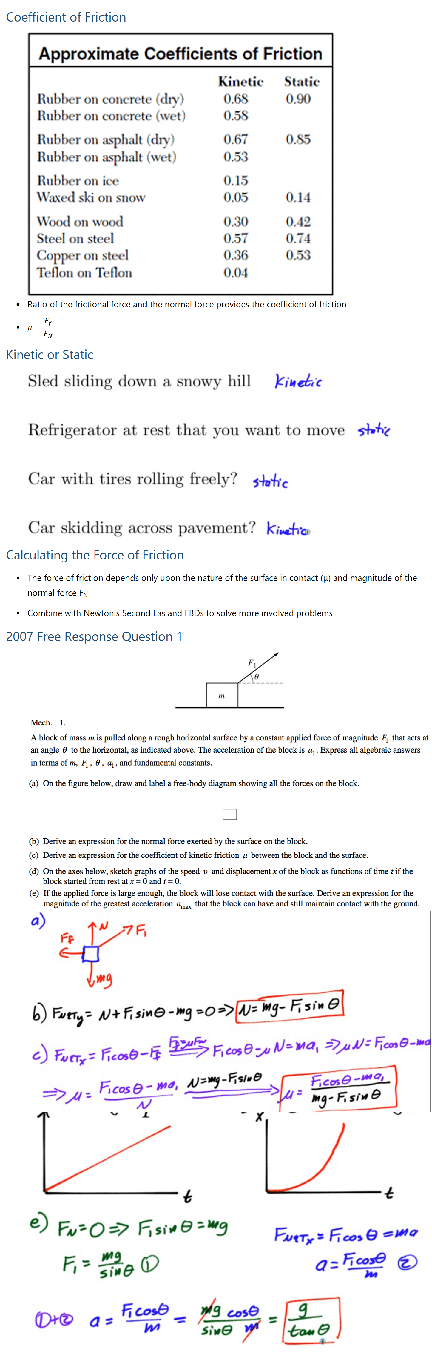 Coefficient of Friction • Ratio of the frictional force and the normal force provides the coefficient of friction • μ=F_f/F_N Kinetic or Static Calculating the Force of Friction • The force of friction depends only upon the nature of the surface in contact (μ) and magnitude of the normal force FN • Combine with Newtons Second Las and FBDs to solve more involved problems 2007 Free Response Question 1