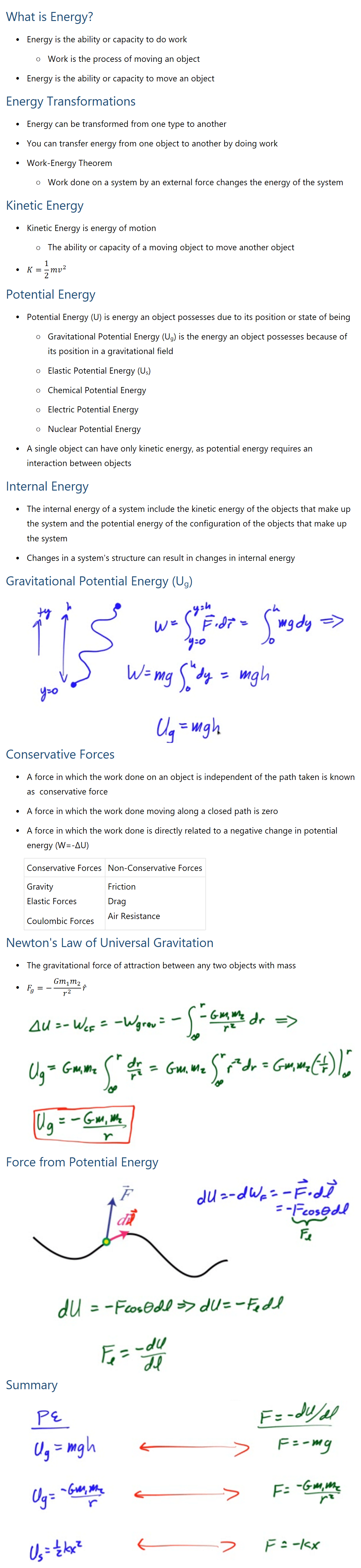 What is Energy? • Energy is the ability or capacity to do work ○ Work is the process of moving an object • Energy is the ability or capacity to move an object Energy Transformations • Energy can be transformed from one type to another • You can transfer energy from one object to another by doing work • Work-Energy Theorem ○ Work done on a system by an external force changes the energy of the system Kinetic Energy • Kinetic Energy is energy of motion ○ The ability or capacity of a moving object to move another object • K=1/2 〖mv〗^2 Potential Energy • Potential Energy (U) is energy an object possesses due to its position or state of being ○ Gravitational Potential Energy (Ug) is the energy an object possesses because of its position in a gravitational field ○ Elastic Potential Energy (Us) ○ Chemical Potential Energy ○ Electric Potential Energy ○ Nuclear Potential Energy • A single object can have only kinetic energy, as potential energy requires an interaction between objects Internal Energy • The internal energy of a system include the kinetic energy of the objects that make up the system and the potential energy of the configuration of the objects that make up the system • Changes in a system’s structure can result in changes in internal energy Gravitational Potential Energy (Ug) Conservative Forces • A force in which the work done on an object is independent of the path taken is known as conservative force • A force in which the work done moving along a closed path is zero • A force in which the work done is directly related to a negative change in potential energy (W=-ΔU) Conservative Forces Non-Conservative Forces Gravity Elastic Forces Friction Drag Air Resistance Coulombic Forces Newton’s Law of Universal Gravitation • The gravitational force of attraction between any two objects with mass • F_g=−(〖Gm〗_1 m_2)/r^2 r ̂ Force from Potential Energy Summary