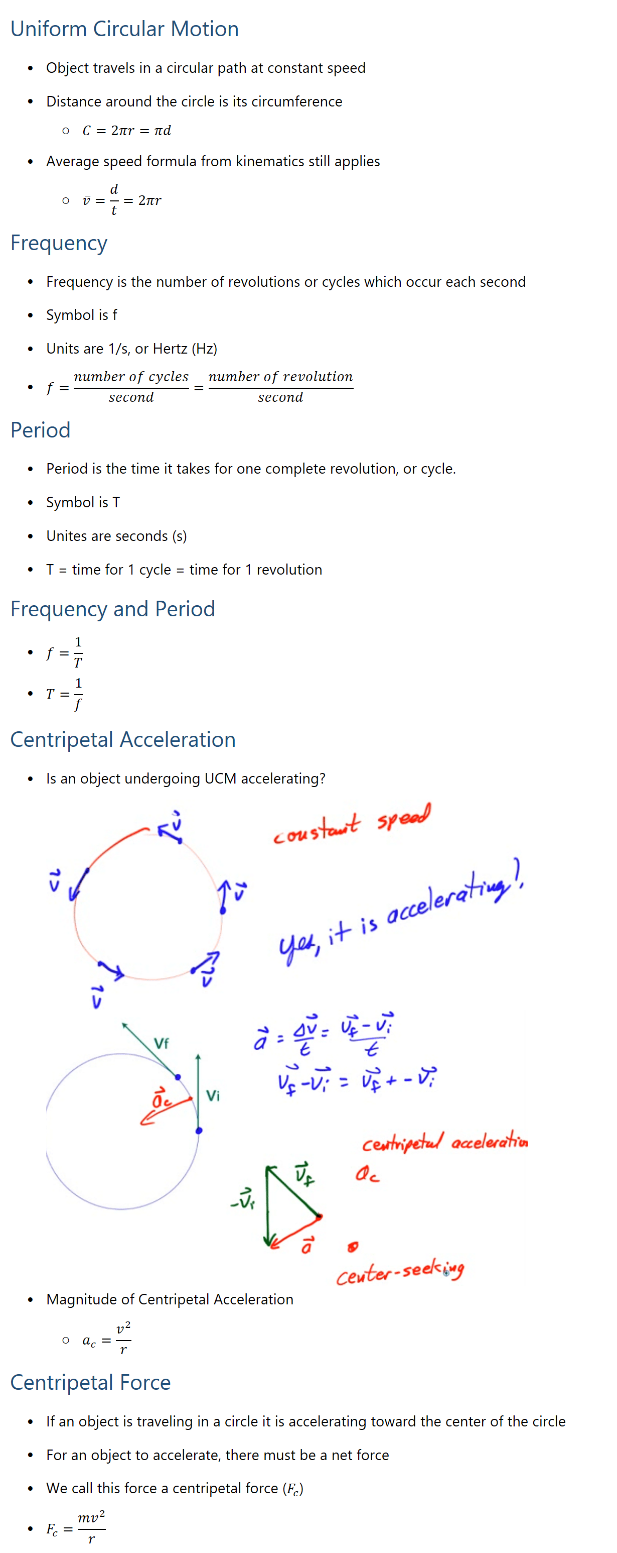 Uniform Circular Motion • Object travels in a circular path at constant speed • Distance around the circle is its circumference ○ C=2πr=πd • Average speed formula from kinematics still applies ○ v ̅=d/t=2πr Frequency • Frequency is the number of revolutions or cycles which occur each second • Symbol is f • Units are 1/s, or Hertz (Hz) • f=(number of cycles)/second=(number of revolution)/second Period • Period is the time it takes for one complete revolution, or cycle. • Symbol is T • Unites are seconds (s) • T = time for 1 cycle = time for 1 revolution Frequency and Period • f=1/T • T=1/f Centripetal Acceleration • Is an object undergoing UCM accelerating? • Magnitude of Centripetal Acceleration ○ a_c=v^2/r Centripetal Force • If an object is traveling in a circle it is accelerating toward the center of the circle • For an object to accelerate, there must be a net force • We call this force a centripetal force (F_c) • F_c=(mv^2)/r