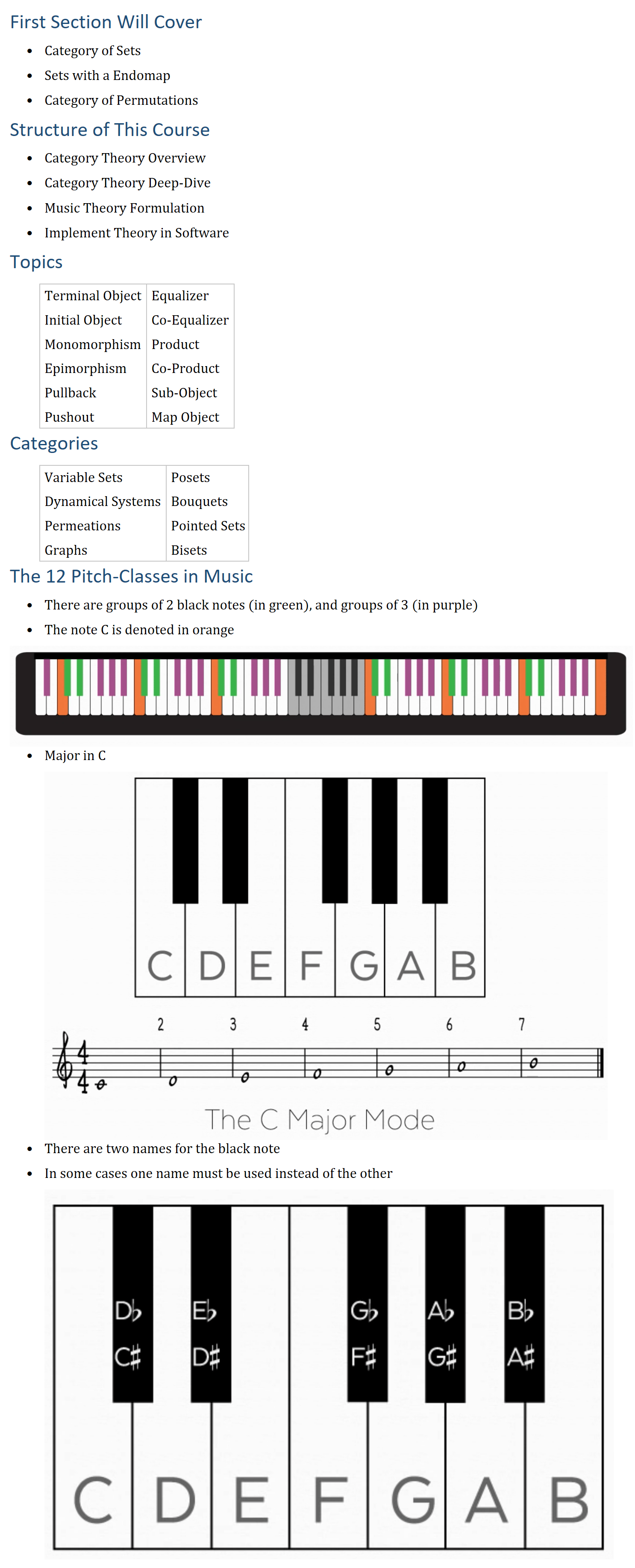First Section Will Cover • Category of Sets • Sets with a Endomap • Category of Permutations Structure of This Course • Category Theory Overview • Category Theory Deep-Dive • Music Theory Formulation • Implement Theory in Software Topics Terminal Object Equalizer Initial Object Co-Equalizer Monomorphism Product Epimorphism Co-Product Pullback Sub-Object Pushout Map Object Categories Variable Sets Posets Dynamical Systems Bouquets Permeations Pointed Sets Graphs Bisets The 12 Pitch-Classes in Music • There are groups of 2 black notes (in green), and groups of 3 (in purple) • The note C is denoted in orange • Major in C • There are two names for the black note • In some cases one name must be used instead of the other