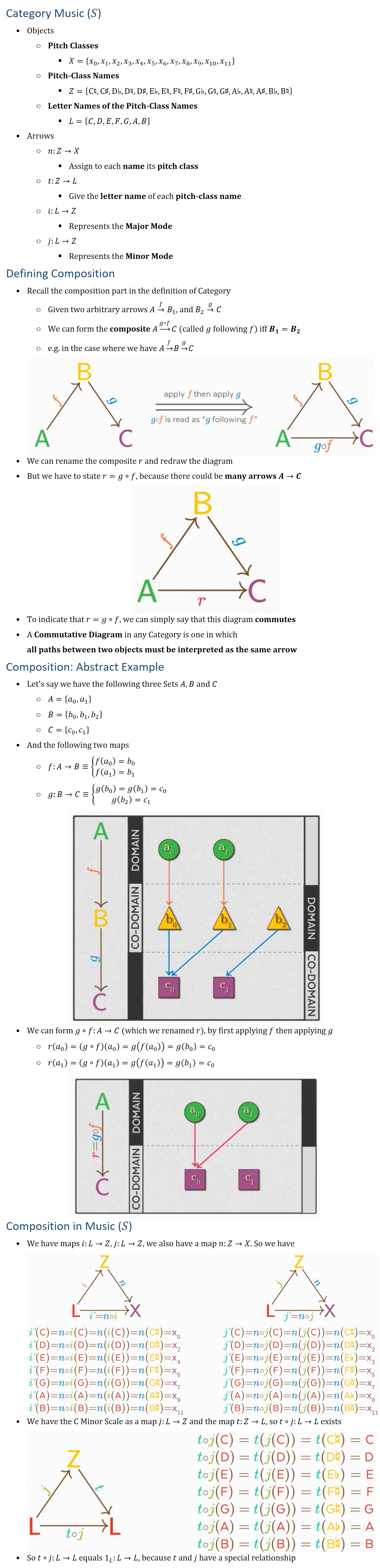 Category Music (S) • Objects ○ Pitch Classes § X={x_0,x_1,x_2,x_3,x_4,x_5,x_6,x_7,x_8,x_9,x_10,x_11 } ○ Pitch-Class Names § Z={C♮,C♯,D♭,D♮,D♯,E♭,E♮,F♮,F♯,G♭,G♮,G♯,A♭,A♮,A♯,B♭,B♮} ○ Letter Names of the Pitch-Class Names § L={C,D,E,F,G,A,B} • Arrows ○ n:Z→X § Assign to each name its pitch class ○ t:Z→L § Give the letter name of each pitch-class name ○ i:L→Z § Represents the Major Mode ○ j:L→Z § Represents the Minor Mode Defining Composition • Recall the composition part in the definition of Category ○ Given two arbitrary arrows A →┴f B_1, and B_2 →┴g C ○ We can form the composite A→┴(g∘f) C (called g following f) iff B_1=B_2 ○ e.g. in the case where we have A→┴f B→┴g C • We can rename the composite r and redraw the diagram • But we have to state r=g∘f, because there could be many arrows A→C • To indicate that r=g∘f, we can simply say that this diagram commutes • A Commutative Diagram in any Category is one in which all paths between two objects must be interpreted as the same arrow Composition: Abstract Example • Let s say we have the following three Sets A,B and C ○ A={a_0,a_1 } ○ B={b_0,b_1,b_2 } ○ C={c_0,c_1 } • And the following two maps ○ f:A→B≡{█(f(a_0 )=b_0@f(a_1 )=b_1 )┤ ○ g:B→C≡{█(g(b_0 )=g(b_1 )=c_0@g(b_2 )=c_1 )┤ • We can form g∘f:A→C (which we renamed r), by first applying f then applying g ○ r(a_0 )=(g∘f)(a_0 )=g(f(a_0 ))=g(b_0 )=c_0 ○ r(a_1 )=(g∘f)(a_1 )=g(f(a_1 ))=g(b_1 )=c_0 Composition in Music (S) • We have maps i:L→Z, j:L→Z, we also have a map n:Z→X. So we have • We have the C Minor Scale as a map j:L→Z and the map t:Z→L, so t∘j:L→L exists • So t∘j:L→L equals 1_L:L→L, because t and j have a special relationship