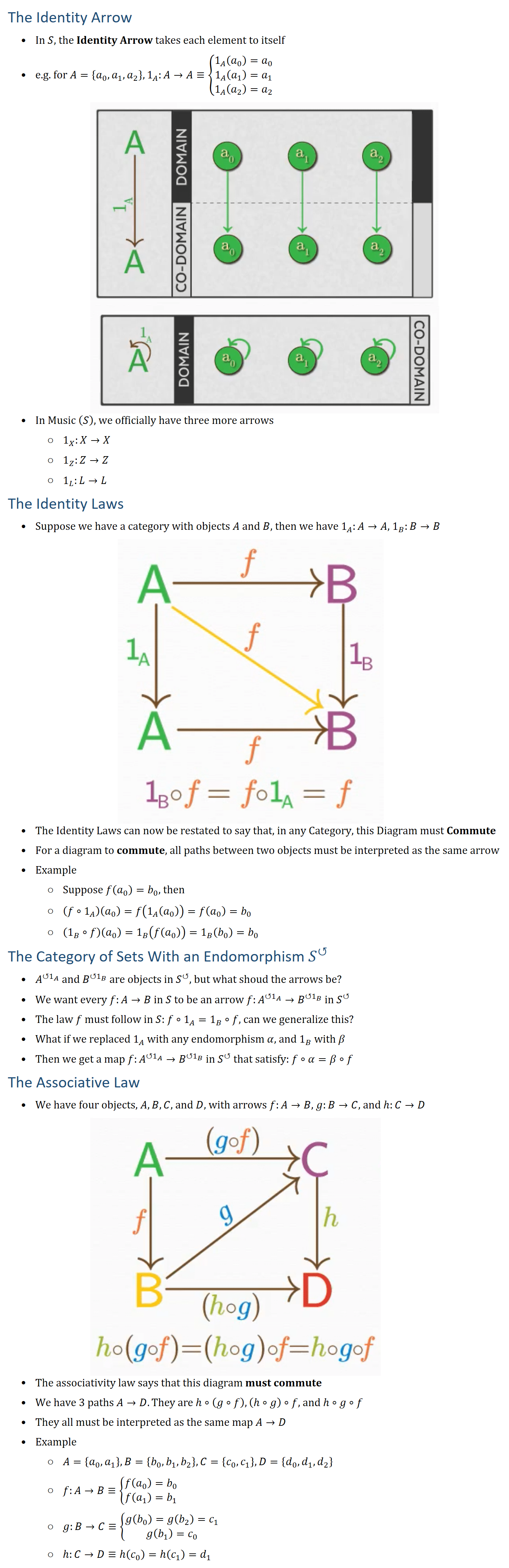 The Identity Arrow • In S, the Identity Arrow takes each element to itself • e.g. for A={a_0,a_1,a_2 },1_A:A→A≡{█(1_A (a_0 )=a_0@1_A (a_1 )=a_1@1_A (a_2 )=a_2 )┤ • In Music (S), we officially have three more arrows ○ 1_X:X→X ○ 1_Z:Z→Z ○ 1_L:L→L The Identity Laws • Suppose we have a category with objects A and B, then we have 1_A:A→A, 1_B:B→B • The Identity Laws can now be restated to say that, in any Category, this Diagram must Commute • For a diagram to commute, all paths between two objects must be interpreted as the same arrow • Example ○ Suppose f(a_0 )=b_0, then ○ (f∘1_A )(a_0 )=f(1_A (a_0 ))=f(a_0 )=b_0 ○ (1_B∘f)(a_0 )=1_B (f(a_0 ))=1_B (b_0 )=b_0 The Category of Sets With an Endomorphism S^↺ • A^(↺1_A ) and B^(↺1_B ) are objects in S^↺, but what shoud the arrows be? • We want every f:A→B in S to be an arrow f:A^(↺1_A )→B^(↺1_B ) in S^↺ • The law f must follow in S: f∘1_A=1_B∘f, can we generalize this? • What if we replaced 1_A with any endomorphism α, and 1_B with β • Then we get a map f:A^(↺1_A )→B^(↺1_B ) in S^↺ that satisfy: f∘α=β∘f The Associative Law • We have four objects, A,B,C, and D, with arrows f:A→B, g:B→C, and h:C→D • The associativity law says that this diagram must commute • We have 3 paths A→D. They are h∘(g∘f),(hg)∘f, and h∘g∘f • They all must be interpreted as the same map A→D • Example ○ A={a_0,a_1 }, B={b_0,b_1,b_2 }, C={c_0,c_1 },D={d_0,d_1,d_2 } ○ f:A→B≡{█(f(a_0 )=b_0@f(a_1 )=b_1 )┤ ○ g:B→C≡{█(g(b_0 )=g(b_2 )=c_1@g(b_1 )=c_0 )┤ ○ h:C→D≡h(c_0 )=h(c_1 )=d_1