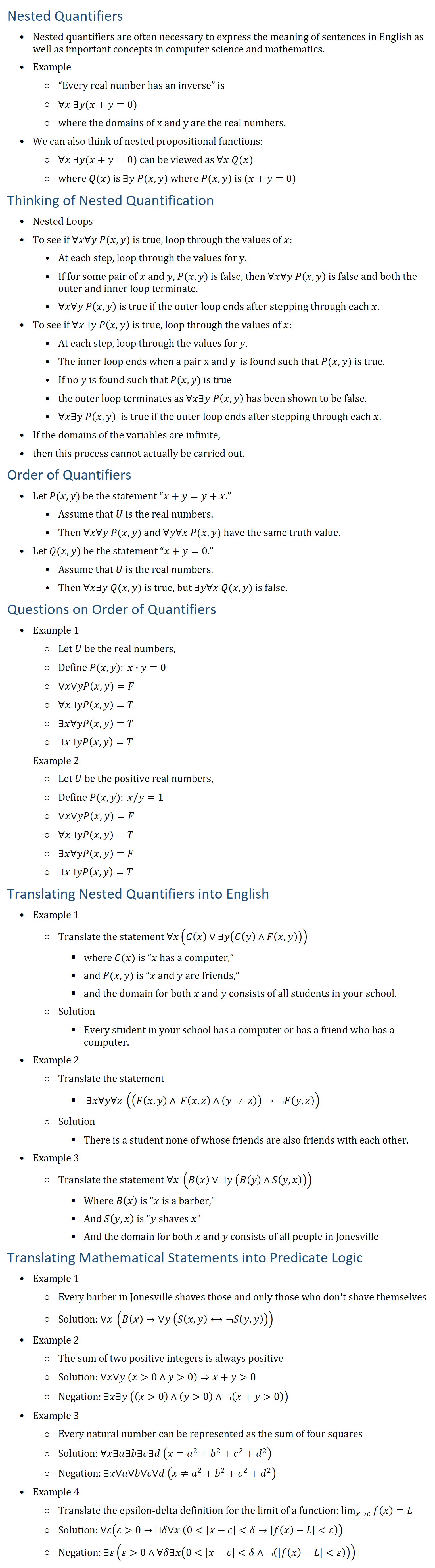 Nested Quantifiers • Nested quantifiers are often necessary to express the meaning of sentences in English as well as important concepts in computer science and mathematics. • Example ○ “Every real number has an inverse” is ○ ∀x ∃y(x+y=0) ○ where the domains of x and y are the real numbers. • We can also think of nested propositional functions: ○ ∀x ∃y(x+y=0) can be viewed as ∀x Q(x) ○ where Q(x) is ∃y P(x, y) where P(x, y) is (x+y=0) Thinking of Nested Quantification • Nested Loops • To see if ∀x∀y P(x,y) is true, loop through the values of x: • At each step, loop through the values for y. • If for some pair of x and y, P(x,y) is false, then ∀x∀y P(x,y) is false and both the outer and inner loop terminate. • ∀x∀y P(x,y) is true if the outer loop ends after stepping through each x. • To see if ∀x∃y P(x,y) is true, loop through the values of x: • At each step, loop through the values for y. • The inner loop ends when a pair x and y is found such that P(x, y) is true. • If no y is found such that P(x, y) is true • the outer loop terminates as ∀x∃y P(x,y) has been shown to be false. • ∀x∃y P(x,y) is true if the outer loop ends after stepping through each x. • If the domains of the variables are infinite, • then this process cannot actually be carried out. Order of Quantifiers • Let P(x,y) be the statement “x+y=y+x.” • Assume that U is the real numbers. • Then ∀x∀y P(x,y) and ∀y∀x P(x,y) have the same truth value. • Let Q(x,y) be the statement “x+y=0.” • Assume that U is the real numbers. • Then ∀x∃y Q(x,y) is true, but ∃y∀x Q(x,y) is false. Questions on Order of Quantifiers • Example 1 ○ Let U be the real numbers, ○ Define P(x,y): x∙y=0 ○ ∀x∀yP(x,y)=F ○ ∀x∃yP(x,y)=T ○ ∃x∀yP(x,y)=T ○ ∃x∃yP(x,y)=T Example 2 ○ Let U be the positive real numbers, ○ Define P(x,y): x/y=1 ○ ∀x∀yP(x,y)=F ○ ∀x∃yP(x,y)=T ○ ∃x∀yP(x,y)=F ○ ∃x∃yP(x,y)=T Translating Nested Quantifiers into English • Example 1 ○ Translate the statement ∀x(C(x)∨∃y(C(y)∧F(x, y))) § where C(x) is “x has a computer,” § and F(x,y) is “x and y are friends,” § and the domain for both x and y consists of all students in your school. ○ Solution § Every student in your school has a computer or has a friend who has a computer. • Example 2 ○ Translate the statement § ∃x∀y∀z ((F(x, y)∧ F(x,z)∧(y ≠z))→¬F(y,z)) ○ Solution § There is a student none of whose friends are also friends with each other. • Example 3 ○ Translate the statement ∀x (B(x)∨∃y (B(y)∧S(y,x))) § Where B(x) is