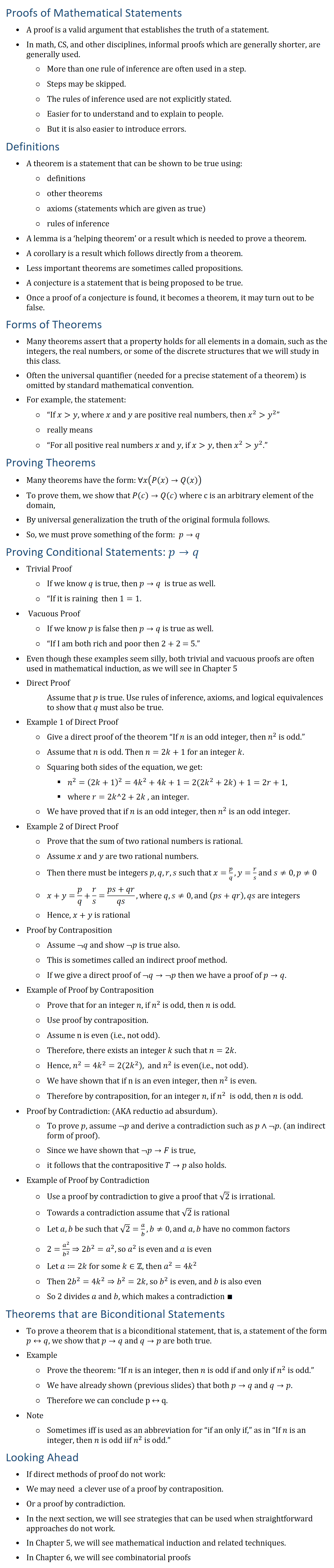 Proofs of Mathematical Statements • A proof is a valid argument that establishes the truth of a statement. • In math, CS, and other disciplines, informal proofs which are generally shorter, are generally used. ○ More than one rule of inference are often used in a step. ○ Steps may be skipped. ○ The rules of inference used are not explicitly stated. ○ Easier for to understand and to explain to people. ○ But it is also easier to introduce errors. Definitions • A theorem is a statement that can be shown to be true using: ○ definitions ○ other theorems ○ axioms (statements which are given as true) ○ rules of inference • A lemma is a ‘helping theorem’ or a result which is needed to prove a theorem. • A corollary is a result which follows directly from a theorem. • Less important theorems are sometimes called propositions. • A conjecture is a statement that is being proposed to be true. • Once a proof of a conjecture is found, it becomes a theorem, it may turn out to be false. Forms of Theorems • Many theorems assert that a property holds for all elements in a domain, such as the integers, the real numbers, or some of the discrete structures that we will study in this class. • Often the universal quantifier (needed for a precise statement of a theorem) is omitted by standard mathematical convention. • For example, the statement: ○ “If xy, where x and y are positive real numbers, then x2y2” ○ really means ○ “For all positive real numbers x and y, if xy, then x2y2.” Proving Theorems • Many theorems have the form: ∀x(P(x)→Q(x)) • To prove them, we show that P(c)→Q(c) where c is an arbitrary element of the domain, • By universal generalization the truth of the original formula follows. • So, we must prove something of the form: p→q Proving Conditional Statements: p→q • Trivial Proof ○ If we know q is true, then p→q is true as well. ○ “If it is raining then 1=1. • Vacuous Proof ○ If we know p is false then p→q is true as well. ○ “If I am both rich and poor then 2 + 2 = 5.” • Even though these examples seem silly, both trivial and vacuous proofs are often used in mathematical induction, as we will see in Chapter 5 • Direct Proof Assume that p is true. Use rules of inference, axioms, and logical equivalences to show that q must also be true. • Example 1 of Direct Proof ○ Give a direct proof of the theorem “If n is an odd integer, then n^2 is odd.” ○ Assume that n is odd. Then n=2k+1 for an integer k. ○ Squaring both sides of the equation, we get: § n2=(2k+1)2=4k2+4k+1=2(2k2+2k)+1=2r+1, § where r=2k^2+2k , an integer. ○ We have proved that if n is an odd integer, then n^2 is an odd integer. • Example 2 of Direct Proof ○ Prove that the sum of two rational numbers is rational. ○ Assume x and y are two rational numbers. ○ Then there must be integers p,q,r,s such that x=p/q, y=r/s and s≠0, p≠0 ○ x+y=p/q+r/s=(ps+qr)/qs, where q,s≠0, and (ps+qr),qs are integers ○ Hence, x+y is rational • Proof by Contraposition ○ Assume ¬q and show ¬p is true also. ○ This is sometimes called an indirect proof method. ○ If we give a direct proof of ¬q→¬p then we have a proof of p→q. • Example of Proof by Contraposition ○ Prove that for an integer n, if n^2 is odd, then n is odd. ○ Use proof by contraposition. ○ Assume n is even (i.e., not odd). ○ Therefore, there exists an integer k such that n=2k. ○ Hence, n2=4k2=2(2k^2), and n^2 is even(i.e., not odd). ○ We have shown that if n is an even integer, then n^2 is even. ○ Therefore by contraposition, for an integer n, if n^2 is odd, then n is odd. • Proof by Contradiction: (AKA reductio ad absurdum). ○ To prove p, assume ¬p and derive a contradiction such as p∧¬p. (an indirect form of proof). ○ Since we have shown that ¬p→F is true, ○ it follows that the contrapositive T→p also holds. • Example of Proof by Contradiction ○ Use a proof by contradiction to give a proof that √2 is irrational. ○ Towards a contradiction assume that √2 is rational ○ Let a,b be such that √2=a/b, b≠0, and a,b have no common factors ○ 2=a2/b2 ⇒2b2=a2, so a^2 is even and a is even ○ Let a≔2k for some k∈Z, then a2=4k2 ○ Then 2b2=4k2⇒b^2=2k, so b^2 is even, and b is also even ○ So 2 divides a and b, which makes a contradiction ∎ Theorems that are Biconditional Statements • To prove a theorem that is a biconditional statement, that is, a statement of the form p↔︎q, we show that p→q and q→p are both true. • Example ○ Prove the theorem: “If n is an integer, then n is odd if and only if n^2 is odd.” ○ We have already shown (previous slides) that both p→q and q→p. ○ Therefore we can conclude p ↔︎ q. • Note ○ Sometimes iff is used as an abbreviation for “if an only if,” as in “If n is an integer, then n is odd iif n^2 is odd.” Looking Ahead • If direct methods of proof do not work: • We may need a clever use of a proof by contraposition. • Or a proof by contradiction. • In the next section, we will see strategies that can be used when straightforward approaches do not work. • In Chapter 5, we will see mathematical induction and related techniques. • In Chapter 6, we will see combinatorial proofs