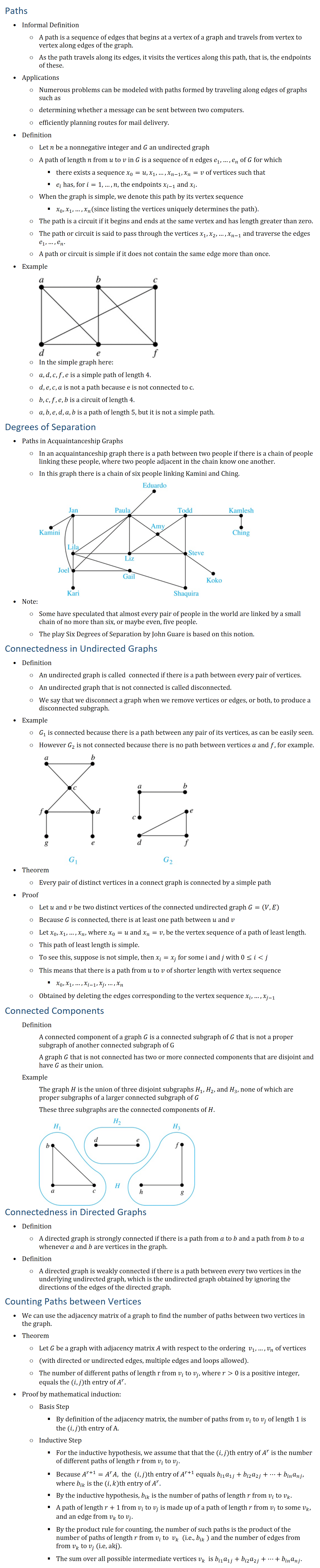 Paths • Informal Definition ○ A path is a sequence of edges that begins at a vertex of a graph and travels from vertex to vertex along edges of the graph. ○ As the path travels along its edges, it visits the vertices along this path, that is, the endpoints of these. • Applications ○ Numerous problems can be modeled with paths formed by traveling along edges of graphs such as ○ determining whether a message can be sent between two computers. ○ efficiently planning routes for mail delivery. • Definition ○ Let n be a nonnegative integer and G an undirected graph ○ A path of length n from u to v in G is a sequence of n edges e_1,…,e_n of G for which § there exists a sequence x_0=u,x_1,…,x_(n−1),x_n=v of vertices such that § e_i has, for i=1,…,n, the endpoints x_(i−1) and x_i. ○ When the graph is simple, we denote this path by its vertex sequence § x_0,x_1,…,x_n (since listing the vertices uniquely determines the path). ○ The path is a circuit if it begins and ends at the same vertex and has length greater than zero. ○ The path or circuit is said to pass through the vertices x_1,x_2,…,x_(n−1) and traverse the edges e_1,…,e_n. ○ A path or circuit is simple if it does not contain the same edge more than once. • Example ○ In the simple graph here: ○ a, d, c, f, e is a simple path of length 4. ○ d, e, c, a is not a path because e is not connected to c. ○ b, c, f, e, b is a circuit of length 4. ○ a, b, e, d, a, b is a path of length 5, but it is not a simple path. Degrees of Separation • Paths in Acquaintanceship Graphs ○ In an acquaintanceship graph there is a path between two people if there is a chain of people linking these people, where two people adjacent in the chain know one another. ○ In this graph there is a chain of six people linking Kamini and Ching. • Note: ○ Some have speculated that almost every pair of people in the world are linked by a small chain of no more than six, or maybe even, five people. ○ The play Six Degrees of Separation by John Guare is based on this notion. Connectedness in Undirected Graphs • Definition ○ An undirected graph is called connected if there is a path between every pair of vertices. ○ An undirected graph that is not connected is called disconnected. ○ We say that we disconnect a graph when we remove vertices or edges, or both, to produce a disconnected subgraph. • Example ○ G_1 is connected because there is a path between any pair of its vertices, as can be easily seen. ○ However G_2 is not connected because there is no path between vertices a and f, for example. • Theorem ○ Every pair of distinct vertices in a connect graph is connected by a simple path • Proof ○ Let u and v be two distinct vertices of the connected undirected graph G=(V,E) ○ Because G is connected, there is at least one path between u and v ○ Let x_0,x_1,…,x_n, where x_0=u and x_n=v, be the vertex sequence of a path of least length. ○ This path of least length is simple. ○ To see this, suppose is not simple, then x_i=x_j for some i and j with 0≤i j ○ This means that there is a path from u to v of shorter length with vertex sequence § x_0,x_1,…,x_(i−1),x_j,…,x_n ○ Obtained by deleting the edges corresponding to the vertex sequence x_i,…,x_(j−1) Connected Components Definition A connected component of a graph G is a connected subgraph of G that is not a proper subgraph of another connected subgraph of G A graph G that is not connected has two or more connected components that are disjoint and have G as their union. Example The graph H is the union of three disjoint subgraphs H_1, H_2, and H_3, none of which are proper subgraphs of a larger connected subgraph of G These three subgraphs are the connected components of H. Connectedness in Directed Graphs • Definition ○ A directed graph is strongly connected if there is a path from a to b and a path from b to a whenever a and b are vertices in the graph. • Definition ○ A directed graph is weakly connected if there is a path between every two vertices in the underlying undirected graph, which is the undirected graph obtained by ignoring the directions of the edges of the directed graph. Counting Paths between Vertices • We can use the adjacency matrix of a graph to find the number of paths between two vertices in the graph. • Theorem ○ Let G be a graph with adjacency matrix A with respect to the ordering v_1,…,v_n of vertices ○ (with directed or undirected edges, multiple edges and loops allowed). ○ The number of different paths of length r from v_i to v_j, where r 0 is a positive integer, equals the (i,j)th entry of A^r. • Proof by mathematical induction: ○ Basis Step § By definition of the adjacency matrix, the number of paths from v_i to v_j of length 1 is the (i,j)th entry of A. ○ Inductive Step § For the inductive hypothesis, we assume that that the (i,j)th entry of A^r is the number of different paths of length r from v_i to v_j. § Because A(r+1)=Ar A, the (i,j)th entry of A^(r+1) equals b_i1 a_1j+b_i2 a_2j+…+b_in a_nj, where b_ik is the (i,k)th entry of A^r. § By the inductive hypothesis, b_ik is the number of paths of length r from v_i to v_k. § A path of length r + 1 from v_i to v_j is made up of a path of length r from v_i to some v_k, and an edge from v_k to v_j. § By the product rule for counting, the number of such paths is the product of the number of paths of length r from v_i to v_k (i.e., b_ik ) and the number of edges from from v_k to v_j (i.e, akj). § The sum over all possible intermediate vertices v_k is b_i1 a_1j+b_i2 a_2j+…+b_in a_nj.