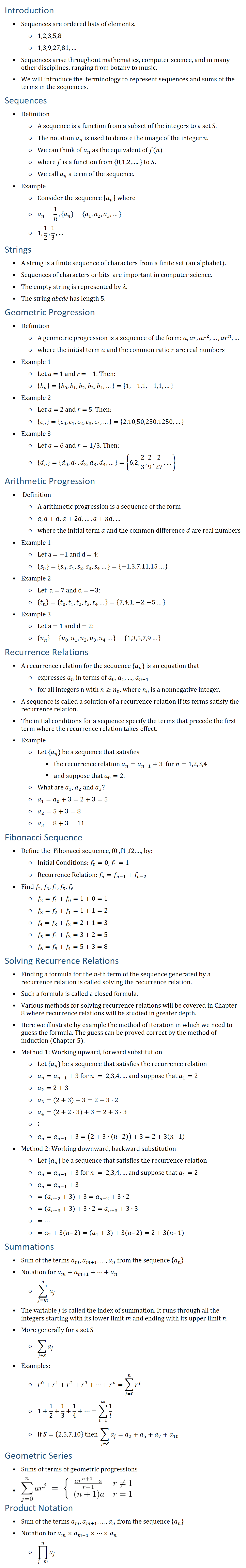 Introduction • Sequences are ordered lists of elements. ○ 1,2,3,5,8 ○ 1,3,9,27,81,… • Sequences arise throughout mathematics, computer science, and in many other disciplines, ranging from botany to music. • We will introduce the terminology to represent sequences and sums of the terms in the sequences. Sequences • Definition ○ A sequence is a function from a subset of the integers to a set S. ○ The notation a_n is used to denote the image of the integer n. ○ We can think of a_n as the equivalent of f(n) ○ where f is a function from {0,1,2,…..} to S. ○ We call a_n a term of the sequence. • Example ○ Consider the sequence {a_n } where ○ a_n=1/n, {a_n }={a_1,a_2,a_3,…} ○ 1, 1/2,1/3,… Strings • A string is a finite sequence of characters from a finite set (an alphabet). • Sequences of characters or bits are important in computer science. • The empty string is represented by λ. • The string abcde has length 5. Geometric Progression • Definition ○ A geometric progression is a sequence of the form: a,ar,ar2,…,arn,… ○ where the initial term a and the common ratio r are real numbers • Example 1 ○ Let a = 1 and r = −1. Then: ○ {b_n }={b_0,b_1,b_2,b_3,b_4,…}={1,−1,1,−1,1,…} • Example 2 ○ Let a = 2 and r = 5. Then: ○ {c_n }={c_0,c_1,c_2,c_3,c_4,…}={2,10,50,250,1250,…} • Example 3 ○ Let a = 6 and r=1/3. Then: ○ {d_n }={d_0,d_1,d_2,d_3,d_4,…}={6,2, 2/3,2/9,2/27,…} Arithmetic Progression • Definition ○ A arithmetic progression is a sequence of the form ○ a,a+d,a+2d,…,a+nd,… ○ where the initial term a and the common difference d are real numbers • Example 1 ○ Let a = −1 and d = 4: ○ {s_n }={s_0,s_1,s_2,s_3,s_4…}={−1,3,7,11,15…} • Example 2 ○ Let a = 7 and d = −3: ○ {t_n }={t_0,t_1,t_2,t_3,t_4…}={7,4,1,−2,−5…} • Example 3 ○ Let a = 1 and d = 2: ○ {u_n }={u_0,u_1,u_2,u_3,u_4…}={1,3,5,7,9…} Recurrence Relations • A recurrence relation for the sequence {a_n} is an equation that ○ expresses a_n in terms of a_0, a_1, …, a_(n−1) ○ for all integers n with n≥n_0, where n_0 is a nonnegative integer. • A sequence is called a solution of a recurrence relation if its terms satisfy the recurrence relation. • The initial conditions for a sequence specify the terms that precede the first term where the recurrence relation takes effect. • Example ○ Let {a_n} be a sequence that satisfies § the recurrence relation a_n=a_(n−1)+3 for n=1,2,3,4 § and suppose that a_0=2. ○ What are a_1, a_2 and a_3? ○ a_1=a_0+3=2+3=5 ○ a_2=5+3=8 ○ a_3=8+3=11 Fibonacci Sequence • Define the Fibonacci sequence, f0 ,f1 ,f2,…, by: ○ Initial Conditions: f_0=0, f_1=1 ○ Recurrence Relation: f_n=f_(n−1)+f_(n−2) • Find f_2,f_3,f_4,f_5,f_6 ○ f_2=f_1+f_0=1+0=1 ○ f_3=f_2+f_1=1+1=2 ○ f_4=f_3+f_2=2+1=3 ○ f_5=f_4+f_3=3+2=5 ○ f_6=f_5+f_4=5+3=8 Solving Recurrence Relations • Finding a formula for the n-th term of the sequence generated by a recurrence relation is called solving the recurrence relation. • Such a formula is called a closed formula. • Various methods for solving recurrence relations will be covered in Chapter 8 where recurrence relations will be studied in greater depth. • Here we illustrate by example the method of iteration in which we need to guess the formula. The guess can be proved correct by the method of induction (Chapter 5). • Method 1: Working upward, forward substitution ○ Let {a_n} be a sequence that satisfies the recurrence relation ○ a_n=a_(n−1)+3 for n = 2,3,4,… and suppose that a_1=2 ○ a_2=2+3 ○ a_3=(2+3)+3=2+3∙2 ○ a_4=(2+2∙3)+3=2+3∙3 ○ ⋮ ○ a_n=a_(n−1)+3=(2+3∙(n–2))+3=2+3(n–1) • Method 2: Working downward, backward substitution ○ Let {a_n} be a sequence that satisfies the recurrence relation ○ a_n=a_(n−1)+3 for n = 2,3,4,… and suppose that a_1=2 ○ a_n=a_(n−1)+3 ○ =(a_(n−2)+3)+3=a_(n−2)+3∙2 ○ =(a_(n−3)+3)+3∙2=a_(n−3)+3∙3 ○ =… ○ =a_2+3(n–2)=(a_1+3)+3(n–2)=2+3(n–1) Summations • Sum of the terms a_m,a_(m+1),…,a_n from the sequence {a_n } • Notation for a_m+a_(m+1)+…+a_n ○ ∑_(j=m)^n▒a_j • The variable j is called the index of summation. It runs through all the integers starting with its lower limit m and ending with its upper limit n. • More generally for a set S ○ ∑_(j∈S)▒a_j • Examples: ○ r0+r1+r2+r3+…+rn=∑_(j=0)n▒r^j ○ 1+1/2+1/3+1/4+…=∑_(i=1)^∞▒1/i ○ If S={2,5,7,10} then ∑_(j∈S)▒a_j =a_2+a_5+a_7+a_10 Geometric Series • Sums of terms of geometric progressions • Product Notation • Sum of the terms a_m,a_(m+1),…,a_n from the sequence {a_n } • Notation for a_m×a_(m+1)×…×a_n ○ ∏_(j=m)^n▒a_j