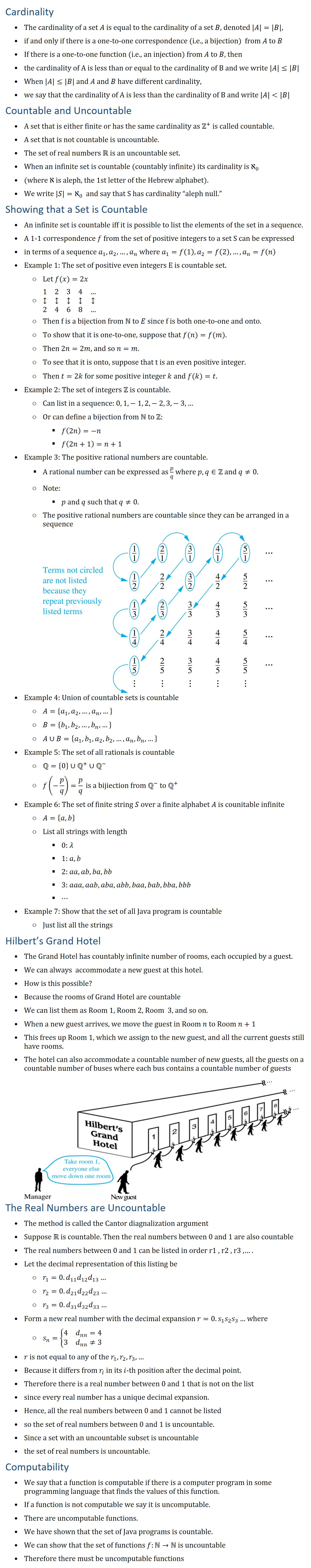 Cardinality • The cardinality of a set A is equal to the cardinality of a set B, denoted |A|=|B|, • if and only if there is a one-to-one correspondence (i.e., a bijection) from A to B • If there is a one-to-one function (i.e., an injection) from A to B, then • the cardinality of A is less than or equal to the cardinality of B and we write |A|≤|B| • When |A|≤|B| and A and B have different cardinality, • we say that the cardinality of A is less than the cardinality of B and write |A||B| Countable and Uncountable • A set that is either finite or has the same cardinality as Z+ is called countable. • A set that is not countable is uncountable. • The set of real numbers R is an uncountable set. • When an infinite set is countable (countably infinite) its cardinality is ℵ_0 • (where ℵ is aleph, the 1st letter of the Hebrew alphabet). • We write |S|=ℵ_0 and say that S has cardinality “aleph null.” Showing that a Set is Countable • An infinite set is countable iff it is possible to list the elements of the set in a sequence. • A 1-1 correspondence f from the set of positive integers to a set S can be expressed • in terms of a sequence a_1,a_2,…,a_n where a_1=f(1), a_2=f(2),…,a_n=f(n) • Example 1: The set of positive even integers E is countable set. ○ Let f(x)=2x ○ ■8(1&2&3&4&…@↕&↕&↕&↕&↕@2&4&6&8&…) ○ Then f is a bijection from N to E since f is both one-to-one and onto. ○ To show that it is one-to-one, suppose that f(n)=f(m). ○ Then 2n=2m, and so n=m. ○ To see that it is onto, suppose that t is an even positive integer. ○ Then t=2k for some positive integer k and f(k)=t. • Example 2: The set of integers Z is countable. ○ Can list in a sequence: 0, 1, − 1, 2, − 2, 3, − 3,… ○ Or can define a bijection from N to Z: § f(2n)=−n § f(2n+1)=n+1 • Example 3: The positive rational numbers are countable. § A rational number can be expressed as p/1 where p,q∈Z and q≠0. ○ Note: § p and q such that q≠0. ○ The positive rational numbers are countable since they can be arranged in a sequence • Example 4: Union of countable sets is countable ○ A={a_1,a_2,…,a_n,…} ○ B={b_1,b_2,…,b_n,…} ○ A∪B={a_1,b_1,a_2,b_2,…,a_n,b_n,…} • Example 5: The set of all rationals is countable ○ Q={0}∪Q+∪Q− ○ f(−p/q)=p/q is a bijiection from Q− to Q+ • Example 6: The set of finite string S over a finite alphabet A is counitable infinite ○ A={a,b} ○ List all strings with length § 0: λ § 1: a, b § 2: aa,ab,ba,bb § 3: aaa,aab,aba,abb,baa,bab,bba,bbb § ⋯ • Example 7: Show that the set of all Java program is countable ○ Just list all the strings Hilbert’s Grand Hotel • The Grand Hotel has countably infinite number of rooms, each occupied by a guest. • We can always accommodate a new guest at this hotel. • How is this possible? • Because the rooms of Grand Hotel are countable • We can list them as Room 1, Room 2, Room 3, and so on. • When a new guest arrives, we move the guest in Room n to Room n+1 • This frees up Room 1, which we assign to the new guest, and all the current guests still have rooms. • The hotel can also accommodate a countable number of new guests, all the guests on a countable number of buses where each bus contains a countable number of guests The Real Numbers are Uncountable • The method is called the Cantor diagnalization argument • Suppose R is countable. Then the real numbers between 0 and 1 are also countable • The real numbers between 0 and 1 can be listed in order r1 , r2 , r3 ,… . • Let the decimal representation of this listing be ○ r_1=0.d_11 d_12 d_13… ○ r_2=0.d_21 d_22 d_23… ○ r_3=0.d_31 d_32 d_33… • Form a new real number with the decimal expansion r=0.s_1 s_2 s_3… where ○ s_n={■8(4&d_nn=4@3&d_nn≠3)┤ • r is not equal to any of the r_1,r_2,r_3,… • Because it differs from r_i in its i-th position after the decimal point. • Therefore there is a real number between 0 and 1 that is not on the list • since every real number has a unique decimal expansion. • Hence, all the real numbers between 0 and 1 cannot be listed • so the set of real numbers between 0 and 1 is uncountable. • Since a set with an uncountable subset is uncountable • the set of real numbers is uncountable. Computability • We say that a function is computable if there is a computer program in some programming language that finds the values of this function. • If a function is not computable we say it is uncomputable. • There are uncomputable functions. • We have shown that the set of Java programs is countable. • We can show that the set of functions f:N→N is uncountable • Therefore there must be uncomputable functions