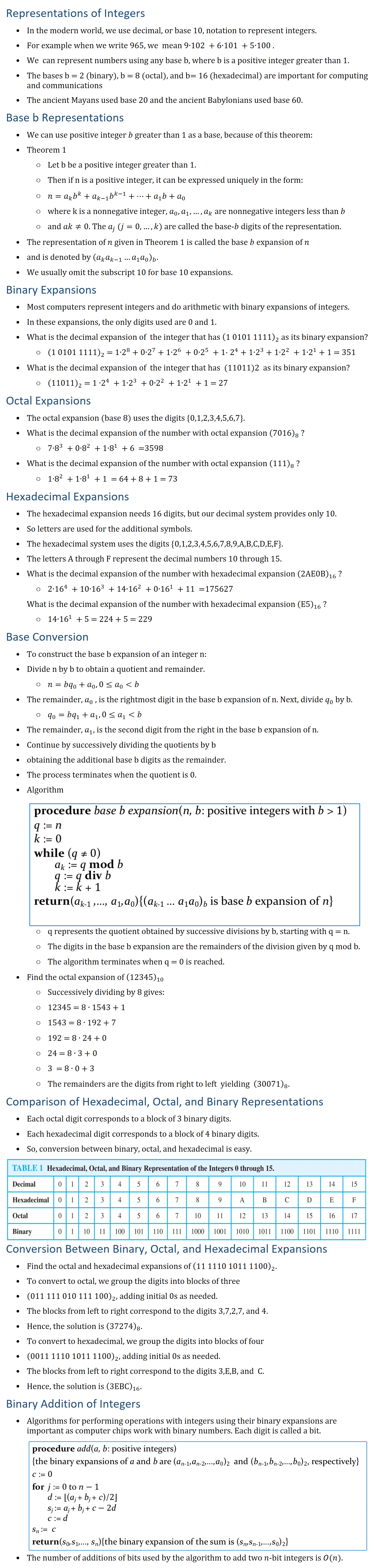Representations of Integers • In the modern world, we use decimal, or base 10, notation to represent integers. • For example when we write 965, we mean 9∙102 + 6∙101 + 5∙100 . • We can represent numbers using any base b, where b is a positive integer greater than 1. • The bases b = 2 (binary), b = 8 (octal), and b= 16 (hexadecimal) are important for computing and communications • The ancient Mayans used base 20 and the ancient Babylonians used base 60. Base b Representations • We can use positive integer b greater than 1 as a base, because of this theorem: • Theorem 1 ○ Let b be a positive integer greater than 1. ○ Then if n is a positive integer, it can be expressed uniquely in the form: ○ n=a_k b^k+a_(k−1) b^(k−1)+…+a_1 b+a_0 ○ where k is a nonnegative integer, a_0,a_1,…,a_k are nonnegative integers less than b ○ and ak≠0. The a_j (j=0,…,k) are called the base-b digits of the representation. • The representation of n given in Theorem 1 is called the base b expansion of n • and is denoted by (a_k a_(k−1)…a_1 a_0 )_b. • We usually omit the subscript 10 for base 10 expansions. Binary Expansions • Most computers represent integers and do arithmetic with binary expansions of integers. • In these expansions, the only digits used are 0 and 1. • What is the decimal expansion of the integer that has (1 0101 1111)_2 as its binary expansion? ○ (1 0101 1111)_2 = 1∙2^8 + 0∙2^7 + 1∙2^6 + 0∙2^5 + 1⋅2^4 + 1∙2^3 + 1∙2^2 + 1∙2^1 + 1 = 351 • What is the decimal expansion of the integer that has (11011)2 as its binary expansion? ○ (11011)_2 = 1 ∙2^4 + 1∙2^3 + 0∙2^2 + 1∙2^1 + 1 = 27 Octal Expansions • The octal expansion (base 8) uses the digits {0,1,2,3,4,5,6,7}. • What is the decimal expansion of the number with octal expansion (7016)_8 ? ○ 7∙8^3 + 0∙8^2 + 1∙8^1 + 6 =3598 • What is the decimal expansion of the number with octal expansion (111)_8 ? ○ 1∙8^2 + 1∙8^1 + 1 = 64 + 8 + 1 = 73 Hexadecimal Expansions • The hexadecimal expansion needs 16 digits, but our decimal system provides only 10. • So letters are used for the additional symbols. • The hexadecimal system uses the digits {0,1,2,3,4,5,6,7,8,9,A,B,C,D,E,F}. • The letters A through F represent the decimal numbers 10 through 15. • What is the decimal expansion of the number with hexadecimal expansion (2AE0B)_16 ? ○ 2∙〖16〗^4 + 10∙〖16〗^3 + 14∙〖16〗^2 + 0∙〖16〗^1 + 11 =175627 What is the decimal expansion of the number with hexadecimal expansion (E5)_16 ? ○ 14∙〖16〗^1 + 5 = 224 + 5 = 229 Base Conversion • To construct the base b expansion of an integer n: • Divide n by b to obtain a quotient and remainder. ○ n=bq_0+a_0, 0≤a_0 b • The remainder, a_0 , is the rightmost digit in the base b expansion of n. Next, divide q_0 by b. ○ q_0=bq_1+a_1, 0≤a_1 b • The remainder, a_1, is the second digit from the right in the base b expansion of n. • Continue by successively dividing the quotients by b • obtaining the additional base b digits as the remainder. • The process terminates when the quotient is 0. • Algorithm ○ q represents the quotient obtained by successive divisions by b, starting with q = n. ○ The digits in the base b expansion are the remainders of the division given by q mod b. ○ The algorithm terminates when q = 0 is reached. • Find the octal expansion of (12345)_10 ○ Successively dividing by 8 gives: ○ 12345 = 8 ∙ 1543 + 1 ○ 1543 = 8 ∙ 192 + 7 ○ 192 = 8 ∙ 24 + 0 ○ 24 = 8 ∙ 3 + 0 ○ 3 = 8 ∙ 0 + 3 ○ The remainders are the digits from right to left yielding (30071)_8. Comparison of Hexadecimal, Octal, and Binary Representations • Each octal digit corresponds to a block of 3 binary digits. • Each hexadecimal digit corresponds to a block of 4 binary digits. • So, conversion between binary, octal, and hexadecimal is easy. Conversion Between Binary, Octal, and Hexadecimal Expansions • Find the octal and hexadecimal expansions of (11 1110 1011 1100)_2. • To convert to octal, we group the digits into blocks of three • (011 111 010 111 100)_2, adding initial 0s as needed. • The blocks from left to right correspond to the digits 3,7,2,7, and 4. • Hence, the solution is (37274)_8. • To convert to hexadecimal, we group the digits into blocks of four • (0011 1110 1011 1100)_2, adding initial 0s as needed. • The blocks from left to right correspond to the digits 3,E,B, and C. • Hence, the solution is (3EBC)_16. Binary Addition of Integers • Algorithms for performing operations with integers using their binary expansions are important as computer chips work with binary numbers. Each digit is called a bit. • The number of additions of bits used by the algorithm to add two n-bit integers is O(n).