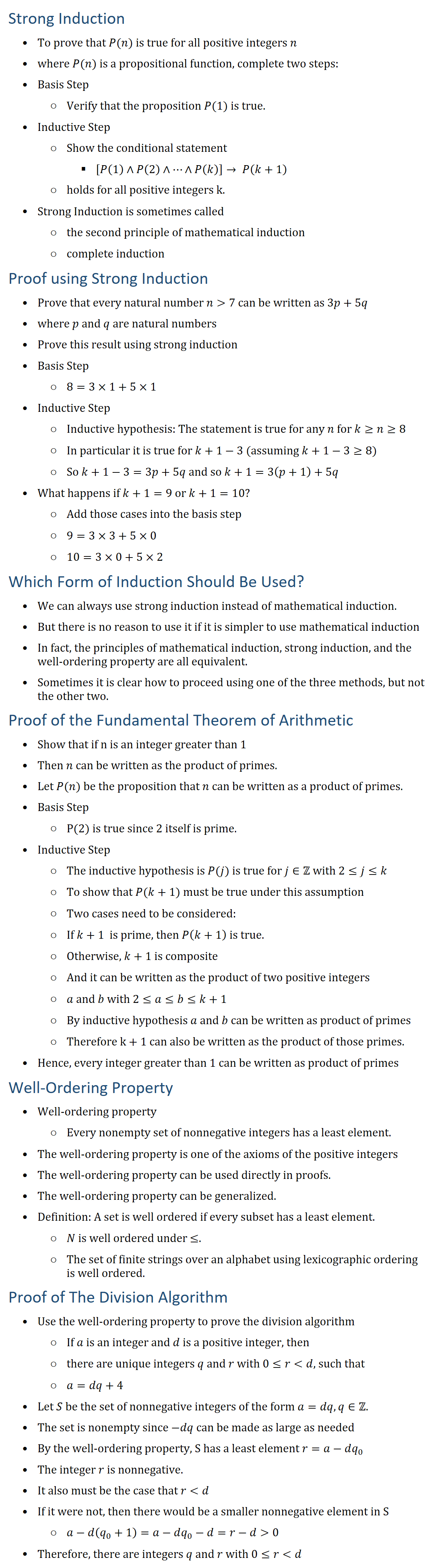 Strong Induction • To prove that P(n) is true for all positive integers n • where P(n) is a propositional function, complete two steps: • Basis Step ○ Verify that the proposition P(1) is true. • Inductive Step ○ Show the conditional statement § [P(1)∧P(2)∧…∧P(k)]→ P(k+1) ○ holds for all positive integers k. • Strong Induction is sometimes called ○ the second principle of mathematical induction ○ complete induction Proof using Strong Induction • Prove that every natural number n 7 can be written as 3p+5q • where p and q are natural numbers • Prove this result using strong induction • Basis Step ○ 8=3×1+5×1 • Inductive Step ○ Inductive hypothesis: The statement is true for any n for k≥n≥8 ○ In particular it is true for k+1−3 (assuming k+1−3≥8) ○ So k+1−3=3p+5q and so k+1=3(p+1)+5q • What happens if k+1=9 or k+1=10? ○ Add those cases into the basis step ○ 9=3×3+5×0 ○ 10=3×0+5×2 Which Form of Induction Should Be Used? • We can always use strong induction instead of mathematical induction. • But there is no reason to use it if it is simpler to use mathematical induction • In fact, the principles of mathematical induction, strong induction, and the well-ordering property are all equivalent. • Sometimes it is clear how to proceed using one of the three methods, but not the other two. Proof of the Fundamental Theorem of Arithmetic • Show that if n is an integer greater than 1 • Then n can be written as the product of primes. • Let P(n) be the proposition that n can be written as a product of primes. • Basis Step ○ P(2) is true since 2 itself is prime. • Inductive Step ○ The inductive hypothesis is P(j) is true for j∈Z with 2≤j≤k ○ To show that P(k+1) must be true under this assumption ○ Two cases need to be considered: ○ If k+1 is prime, then P(k+1) is true. ○ Otherwise, k+1 is composite ○ And it can be written as the product of two positive integers ○ a and b with 2≤a≤b≤k+1 ○ By inductive hypothesis a and b can be written as product of primes ○ Therefore k + 1 can also be written as the product of those primes. • Hence, every integer greater than 1 can be written as product of primes Well-Ordering Property • Well-ordering property ○ Every nonempty set of nonnegative integers has a least element. • The well-ordering property is one of the axioms of the positive integers • The well-ordering property can be used directly in proofs. • The well-ordering property can be generalized. • Definition: A set is well ordered if every subset has a least element. ○ N is well ordered under ≤. ○ The set of finite strings over an alphabet using lexicographic ordering is well ordered. Proof of The Division Algorithm • Use the well-ordering property to prove the division algorithm ○ If a is an integer and d is a positive integer, then ○ there are unique integers q and r with 0≤r d, such that ○ a=dq+4 • Let S be the set of nonnegative integers of the form a=dq, q∈Z. • The set is nonempty since −dq can be made as large as needed • By the well-ordering property, S has a least element r=a−dq_0 • The integer r is nonnegative. • It also must be the case that r d • If it were not, then there would be a smaller nonnegative element in S ○ a−d(q_0+1)=a−dq_0−d=r−d 0 • Therefore, there are integers q and r with 0≤r d