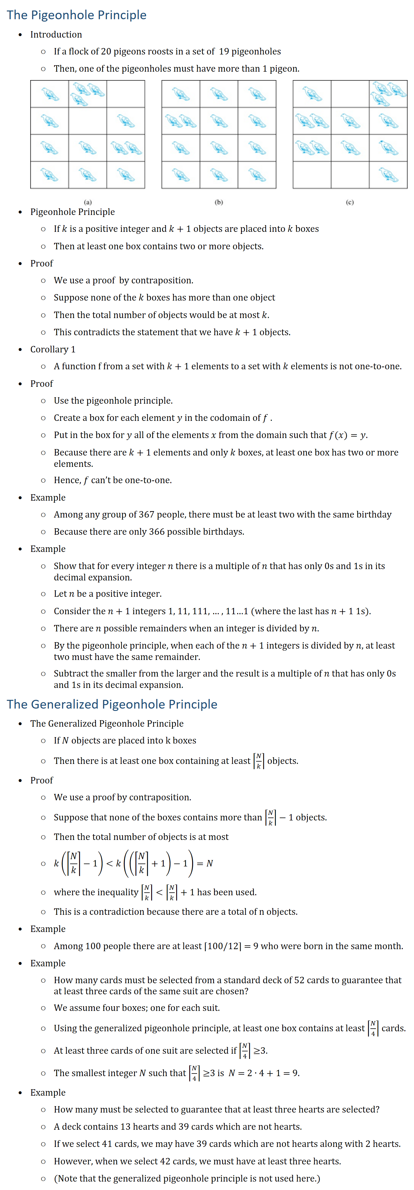 The Pigeonhole Principle • Introduction ○ If a flock of 20 pigeons roosts in a set of 19 pigeonholes ○ Then, one of the pigeonholes must have more than 1 pigeon. • Pigeonhole Principle ○ If k is a positive integer and k + 1 objects are placed into k boxes ○ Then at least one box contains two or more objects. • Proof ○ We use a proof by contraposition. ○ Suppose none of the k boxes has more than one object ○ Then the total number of objects would be at most k. ○ This contradicts the statement that we have k + 1 objects. • Corollary 1 ○ A function f from a set with k + 1 elements to a set with k elements is not one-to-one. • Proof ○ Use the pigeonhole principle. ○ Create a box for each element y in the codomain of f . ○ Put in the box for y all of the elements x from the domain such that f(x)=y. ○ Because there are k + 1 elements and only k boxes, at least one box has two or more elements. ○ Hence, f can’t be one-to-one. • Example ○ Among any group of 367 people, there must be at least two with the same birthday ○ Because there are only 366 possible birthdays. • Example ○ Show that for every integer n there is a multiple of n that has only 0s and 1s in its decimal expansion. ○ Let n be a positive integer. ○ Consider the n + 1 integers 1, 11, 111, … , 11…1 (where the last has n + 1 1s). ○ There are n possible remainders when an integer is divided by n. ○ By the pigeonhole principle, when each of the n + 1 integers is divided by n, at least two must have the same remainder. ○ Subtract the smaller from the larger and the result is a multiple of n that has only 0s and 1s in its decimal expansion. The Generalized Pigeonhole Principle • The Generalized Pigeonhole Principle ○ If N objects are placed into k boxes ○ Then there is at least one box containing at least ⌈N/k⌉ objects. • Proof ○ We use a proof by contraposition. ○ Suppose that none of the boxes contains more than ⌈N/k⌉−1 objects. ○ Then the total number of objects is at most ○ k(⌈N/k⌉−1) k((⌈N/k⌉+1)−1)=N ○ where the inequality ⌈N/k⌉ ⌈N/k⌉+1 has been used. ○ This is a contradiction because there are a total of n objects. • Example ○ Among 100 people there are at least ⌈100/12⌉ = 9 who were born in the same month. • Example ○ How many cards must be selected from a standard deck of 52 cards to guarantee that at least three cards of the same suit are chosen? ○ We assume four boxes; one for each suit. ○ Using the generalized pigeonhole principle, at least one box contains at least ⌈N/4⌉ cards. ○ At least three cards of one suit are selected if ⌈N/4⌉ ≥3. ○ The smallest integer N such that ⌈N/4⌉ ≥3 is N = 2 ∙ 4 + 1 = 9. • Example ○ How many must be selected to guarantee that at least three hearts are selected? ○ A deck contains 13 hearts and 39 cards which are not hearts. ○ If we select 41 cards, we may have 39 cards which are not hearts along with 2 hearts. ○ However, when we select 42 cards, we must have at least three hearts. ○ (Note that the generalized pigeonhole principle is not used here.)