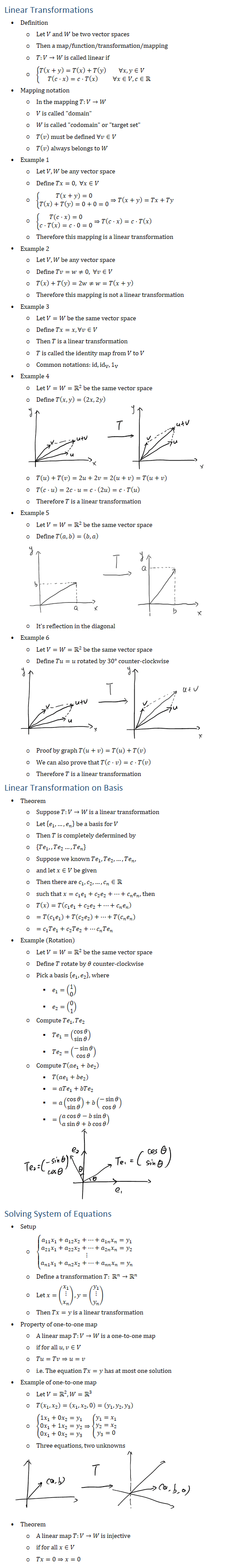 Linear Transformations • Definition ○ Let V and W be two vector spaces ○ Then a map/function/transformation/mapping ○ T:V→W is called linear if ○ {■8(T(x+y)=T(x)+T(y)&∀x,y∈V@T(c⋅x)=c⋅T(x)&∀x∈V,c∈R┤ • Mapping notation ○ In the mapping T:V→W ○ V is called domain ○ W is called codomain or target set ○ T(v) must be defined ∀v∈V ○ T(v) always belongs to W • Example 1 ○ Let V,W be any vector space ○ Define Tx=0, ∀x∈V ○ {█(T(x+y)=0@T(x)+T(y)=0+0=0)┤⇒T(x+y)=Tx+Ty ○ {█(T(c⋅x)=0@c⋅T(x)=c⋅0=0)┤⇒T(c⋅x)=c⋅T(x) ○ Therefore this mapping is a linear transformation • Example 2 ○ Let V,W be any vector space ○ Define Tv=w≠0, ∀v∈V ○ T(x)+T(y)=2w≠w=T(x+y) ○ Therefore this mapping is not a linear transformation • Example 3 ○ Let V=W be the same vector space ○ Define Tx=x, ∀v∈V ○ Then T is a linear transformation ○ T is called the identity map from V to V ○ Common notations: id, id_V, 1_V • Example 4 ○ Let V=W=R2 be the same vector space ○ Define T(x,y)=(2x,2y) ○ T(u)+T(v)=2u+2v=2(u+v)=T(u+v) ○ T(c⋅u)=2c⋅u=c⋅(2u)=c⋅T(u) ○ Therefore T is a linear transformation • Example 5 ○ Let V=W=R2 be the same vector space ○ Define T(a,b)=(b,a) ○ It s reflection in the diagonal • Example 6 ○ Let V=W=R2 be the same vector space ○ Define Tu=u rotated by 30° counter-clockwise ○ Proof by graph T(u+v)=T(u)+T(v) ○ We can also prove that T(c⋅v)=c⋅T(v) ○ Therefore T is a linear transformation Linear Transformation on Basis • Theorem ○ Suppose T:V→W is a linear transformation ○ Let {e_1,…,e_n } be a basis for V ○ Then T is completely defermined by ○ {Te_1,,Te_2…,Te_n } ○ Suppose we known Te_1,Te_2,…,Te_n, ○ and let x∈V be given ○ Then there are c_1,c_2,…,c_n∈R ○ such that x=c_1 e_1+c_2 e_2+…+c_n e_n, then ○ T(x)=T(c_1 e_1+c_2 e_2+…+c_n e_n ) ○ =T(c_1 e_1 )+T(c_2 e_2 )+…+T(c_n e_n ) ○ =c_1 Te_1+c_2 Te_2+…c_n Te_n • Example (Rotation) ○ Let V=W=R2 be the same vector space ○ Define T rotate by θ counter-clockwise ○ Pick a basis {e_1,e_2 }, where § e_1=(█(1@0)) § e_2=(█(0@1)) ○ Compute Te_1, Te_2 § Te_1=(█(cosθ@sinθ )) § Te_2=(█(−sinθ@cosθ )) ○ Compute T(ae_1+be_2 ) § T(ae_1+be_2 ) § =aTe_1+bTe_2 § =a(█(cosθ@sinθ ))+b(█(−sinθ@cosθ )) § =(█(a cosθ−b sinθ@a sinθ+b cosθ )) Solving System of Equations • Setup ○ {█(a_11 x_1+a_12 x_2+…+a_1n x_n=y_1@a_21 x_1+a_22 x_2+…+a_2n x_n=y_2@⋮@a_n1 x_1+a_n2 x_2+…+a_nn x_n=y_n )┤ ○ Define a transformation T: Rn→Rn ○ Let x=(█(x_1@⋮@x_n )), y=(█(y_1@⋮@y_n )) ○ Then Tx=y is a linear transformation • Property of one-to-one map ○ A linear map T:V→W is a one-to-one map ○ if for all u,v∈V ○ Tu=Tv⇒u=v ○ i.e. The equation Tx=y has at most one solution • Example of one-to-one map ○ Let V=R2, W=R3 ○ T(x_1,x_2 )=(x_1,x_2,0)=(y_1,y_2,y_3 ) ○ {█(1x_1+0x_2=y_1@0x_1+1x_2=y_2@0x_1+0x_2=y_3 )┤⇒{█(y_1=x_1@y_2=x_2@y_3=0)┤ ○ Three equations, two unknowns • Theorem ○ A linear map T:V→W is injective ○ if for all x∈V ○ Tx=0⇒x=0