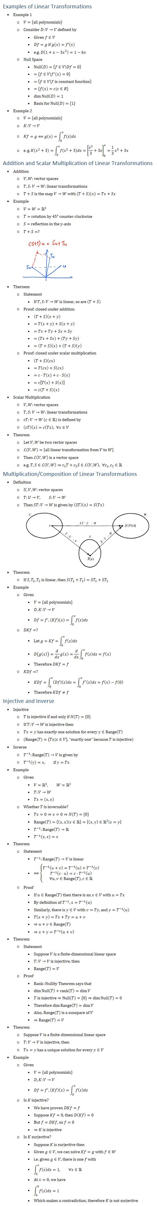 Examples of Linear Transformations • Example 1 ○ V={all polynomials} ○ Consider D:V→V defined by § Given f∈V § Df=g if g(x)=f′(x) § e.g. D(1+x−3x^2 )=1−6x ○ Null Space § Null(D)={f∈V│Df=0} § ={f∈V│f^′ (x)=0} § ={f∈V│f is constant function} § ={f(x)=c│c∈R} § dimNull(D)=1 § Basis for Null(D)={1} • Example 2 ○ V={all polynomials} ○ K:V→V ○ Kf=g⟺g(x)=∫_0^x▒f(s)ds ○ e.g. K(x2+3)=∫_0x▒f(s2+3)ds=[s2/3+3s]_0^x=1/3 x^3+3x Addition and Scalar Multiplication of Linear Transformations • Addition ○ V,W: vector spaces ○ T,S: V→W: linear transformations ○ T+S is the map V→W with (T+S)(x)=Tx+Sx • Example ○ V=W=R2 ○ T= rotation by 45° counter-clockwise ○ S= reflection in the y-axis ○ T+S=? • Theroem ○ Statement § If T,S:V→W is linear, so are (T+S) ○ Proof: closed under addition § (T+S)(x+y) § =T(x+y)+S(x+y) § =Tx+Ty+Sx+Sy § =(Tx+Sx)+(Ty+Sy) § =(T+S)(x)+(T+S)(y) ○ Proof: closed under scalar multiplication § (T+S)(cx) § =T(cx)+S(cx) § =c⋅T(x)+c⋅S(x) § =c[T(x)+S(x)] § =c(T+S)(x) • Scalar Multiplication ○ V,W: vector spaces ○ T,S: V→W: linear transformations ○ cT:V→W (c∈R is defined by ○ (cT)(x)=c(Tx), ∀x∈V • Theorem ○ Let V,W be two vector spaces ○ L(V,W)={all linear transformation from V to W} ○ Then L(V,W) is a vector space ○ e.g. T,S∈L(V,W)⇒c_1 T+c_2 S∈L(V,W), ∀c_1,c_2∈R Multiplication/Composition of Linear Transformations • Definition ○ U,V,W: vector spaces ○ T:U→V, S:V→W ○ Then ST:V→W is given by (ST)(x)=S(Tx) • Theorem ○ If S,T_1,T_2 is linear, then S(T_1+T_2 )=ST_1+ST_2 • Example ○ Given § V={all polynomials} § D,K:V→V § Df=f^′, (Kf)(x)=∫_0^x▒f(s)ds ○ DKf=? § Let g=Kf=∫_0^x▒f(s)ds § D(g(x))=d/dx g(x)=d/dx ∫_0^x▒f(s)ds=f(x) § Therefore DKf=f ○ KDf=? § KDf=∫_0x▒(Df)(s)ds=∫_0x▒〖f^′ (s)ds〗=f(x)−f(0) § Therefore KDf≠f Injective and Inverse • Injective ○ T is injective if and only if N(T)={0} ○ If T:V→W is injective then ○ Tx=y has exactly one solution for every y∈Range(T) ○ (Range(T)={Tx│x∈V}, “exactly one” because T is injective) • Inverse ○ T^(−1):Range(T)→V is given by ○ T^(−1) (y)=x, if y=Tx • Example ○ Given § V=R2, W=R2 § T:V→W § Tx=(x,x) ○ Whether T is inversable? § Tx=0⇒x=0⇒N(T)={0} § Range(T)={(x,x)│x∈R={(x,y)∈R2│x=y} § T^(−1):Range(T)→R § T^(−1) (x,x)=x • Theorem ○ Statement § T^(−1):Range(T)→V is linear § ⟺{█(T^(−1) (u+v)=T^(−1) (u)+T^(−1) (v)@T^(−1) (c⋅u)=c⋅T^(−1) (u)@∀u,v∈Range(T), c∈R┤ ○ Proof § If u∈Range(T) then there is an x∈V with u=Tx § By definition of T^(−1), x=T^(−1) (u) § Similarly, there is y∈V with v=Ty, and y=T^(−1) (u) § T(x+y)=Tx+Ty=u+v § ⇒u+v∈Range(T) § ⇒x+y=T^(−1) (u+v) • Theorem ○ Statement § Suppose V is a finite-dimensional linear space § T:V→V is injective, then § Range(T)=V ○ Proof § Rank–Nullity Theorem says that § dimNull(T)+rank(T)=dimV § T is injective ⇒Null(T)={0}⇒dimNull(T)=0 § Therefore dimRange(T)=dimV § Also, Range(T) is a sunspace of V § ⇒Range(T)=V • Theorem ○ Suppose V is a finite-dimensional linear space ○ T:V→V is injective, then ○ Tx=y has a unique solution for every y∈V • Example ○ Given § V={all polynomials} § D,K:V→V § Df=f^′, (Kf)(x)=∫_0^x▒f(s)ds ○ Is K injective? § We have proven DKf=f § Suppose Kf=0, then D(Kf)=0 § But f=DKf, so f=0 § ⇒K is injective ○ Is K surjective? § Suppose K is surjective then § Given g∈V, we can solve Kf=g with f∈W § i.e. given g∈V, there is one f with § ∫_0^x▒f(s)ds=1, ∀x∈R § At x=0, we have § ∫_0^0▒f(s)ds=1 § Which makes a contradiction, therefore K is not surjective