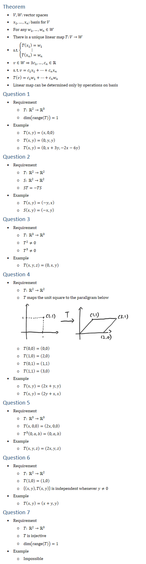 (x_n )=w_n )┤ • v∈W⇒∃c_1,…,c_n∈R • s.t. v=c_1 x_1+…+c_n x_n • T(v)=c_1 w_1+…+c_n w_n • Linear map can be determined only by operations on basis Question 1 • Requirement ○ T: R2→R3 ○ dim(range(T))=1 • Example ○ T(x,y)=(x,0,0) ○ T(x,y)=(0,y,y) ○ T(x,y)=(0,x+3y,−2x−6y) Question 2 • Requirement ○ T: R2→R2 ○ S: R2→R2 ○ ST=−TS • Example ○ T(x,y)=(−y,x) ○ S(x,y)=(−x,y) Question 3 • Requirement ○ T: R3→R3 ○ T^2≠0 ○ T^3≠0 • Example ○ T(x,y,z)=(0,x,y) Question 4 • Requirement ○ T: R2→R2 ○ T maps the unit square to the parallgram below ○ T(0,0)=(0,0) ○ T(1,0)=(2,0) ○ T(0,1)=(1,1) ○ T(1,1)=(3,0) • Example ○ T(x,y)=(2x+y,y) ○ T(x,y)=(2y+x,x) Question 5 • Requirement ○ T: R3→R3 ○ T(x,0,0)=(2x,0,0) ○ T^3 (0,a,b)=(0,a,b) • Example ○ T(x,y,z)=(2x,y,z) Question 6 • Requirement ○ T: R2→R2 ○ T(1,0)=(1,0) ○ {(x,y),T(x,y)} is independent whenever y≠0 • Example ○ T(x,y)=(x+y,y) Question 7 • Requirement ○ T: R2→R3 ○ T is injective ○ dim(range(T))=1 • Example ○ Impossible ” t • — …. ice (1.1) T (1.1) (3.1) I _ _ _ _ _ ” - _ ~) > > (2.0)