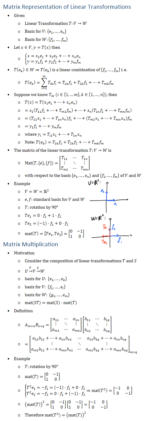 Matrix Representation of Linear Transformations • Given ○ Linear Transformation T:V→W ○ Basis for V: {e_1,…,e_n } ○ Basis for W:{f_1,…,f_m } • Let x∈V, y=T(x) then ○ {█(x=x_1 e_1+x_2 e_2+…+x_n e_n@y=y_1 f_1+y_2 f_2+…+y_m f_m )┤ • T(e_k )∈W⇒T(e_k ) is a linear combination of {f_1,…,f_m } i.e. ○ T(e_k )=∑_(i=1)^m▒〖T_ik f_i 〗=T_1k f_1+T_2k f_2+…+T_mk f_m • Suppose we know T_ik (i∈{1,…m},k∈{1,…,n}), then ○ T(x)=T(x_1 e_1+…+x_n e_n ) ○ =x_1 (T_11 f_1+…+T_m1 f_m )+…+x_n (T_1n f_1+…+T_mn f_m ) ○ =(T_11 x_1+…+T_1n x_n ) f_1+…+(T_m1 x_1+…+T_mn x_n ) f_m ○ =y_1 f_1+…+y_m f_m ○ where y_i=T_i1 x_1+…+T_1n x_n ○ Note: T(e_k )=T_1k f_1+T_2k f_2+…+T_mk f_m • The matrix of the linear transformation T:V→W is ○ Mat(T,{e},{f})=[■8(T_11&⋯&T_1n@⋮&⋱&⋮@T_m1&⋯&T_mn )] ○ with respect to the basis {e_1,…,e_n } and {f_1,…,f_m } of V and W • Example ○ V=W=R2 ○ e,f: standard basis for V and W ○ T: rotation by 90° ○ Te_1=0⋅f_1+1⋅f_2 ○ Te_2=(−1)⋅f_1+0⋅f_2 ○ mat(T)=[Te_1,Te_2 ]=[■8(0&−1@1&0)] Matrix Multiplication • Motivation ○ Consider the composition of linear transformations T and S ○ U→┴T V→┴S W ○ basis for U: {e_1,…,e_k } ○ basis for V: {f_1,…,e_l } ○ basis for W: {g_1,…,e_m } ○ mat(ST)=mat(S)⋅mat(T) • Definition ○ A_(m×n) B_(n×q)=[■8(a_11&⋯&a_1n@⋮&⋱&⋮@a_m1&⋯&a_mn )][■8(b_11&⋯&b_1q@⋮&⋱&⋮@b_n1&⋯&b_nq )] ○ =[■8(a_11 b_11+…+a_1n b_n1&⋯&a_11 b_1q+…+a_1n b_nq@⋮&⋱&⋮@a_m1 b_11+…+a_mn b_n1&⋯&a_m1 b_1q+…+a_mn b_nq )]_(m×q) • Example ○ T: rotation by 90° ○ mat(T)=[■8(0&−1@1&0)] ○ {█(T^2 e_1=−f_1=(−1)⋅f_1+0⋅f_2@T^2 e_2=−f_2=0⋅f_1+(−1)⋅f_2 )┤⇒mat(T^2 )=[■8(−1&0@0&−1)] ○ (mat(T))^2=[■8(0&−1@1&0)][■8(0&−1@1&0)]=[■8(−1&0@0&−1)] ○ Therefore mat(T^2 )=(mat(T))^2 VEIR: ” either Wilkin Their in E € is + Ten