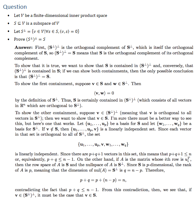 Question • Let V be a finite-dimensional inner product space • S⊆V is a subspace of V • Let S^⊥={v∈V│∀s∈S,⟨v,s⟩=0} Prove (S^⊥ )^⊥=S Answer: First, (S⊥)⊥ is the orthogonal complement of S ⊥, which is itself the orthogonal complement of S, so (S⊥)⊥ = S means that S is the orthogonal complement of its orthogonal complement. To show that it is true, we want to show that S is contained in (S⊥)⊥ and, conversely, that (S⊥)⊥ is contained in S; if we can show both containments, then the only possible conclusion is that (S⊥)⊥ = S. To show the first containment, suppose v ∈ S and w ∈ S ⊥. Then hv, wi = 0 1 by the definition of S ⊥. Thus, S is certainly contained in (S⊥)⊥ (which consists of all vectors in R n which are orthogonal to S ⊥) To show the other containment, suppose v ∈ (S⊥)⊥ (meaning that v is orthogonal to all vectors in S ⊥) then we want to show that v ∈ S. I’m sure there must be a better way to see this, but here’s one that works. Let {u1, . . . , up} be a basis for S and let {w1, . . . , wq} be a basis for S ⊥. If v ∈/ S, then {u1, . . . , up, v} is a linearly independent set. Since each vector in that set is orthogonal to all of S ⊥, the set {u1, . . . , up, v, w1, . . . , wq} is linearly independent. Since there are p+q+1 vectors in this set, this means that p+q+1 ≤ n or, equivalently, p + q ≤ n − 1. On the other hand, if A is the matrix whose ith row is u T i , then the row space of A is S and the nullspace of A is S ⊥. Since S is p-dimensional, the rank of A is p, meaning that the dimension of nul(A) = S ⊥ is q = n − p. Therefore, p + q = p + (n − p) = n, contradicting the fact that p + q ≤ n − 1. From this contradiction, then, we see that, if v ∈ (S⊥)⊥, it must be the case that v ∈ S