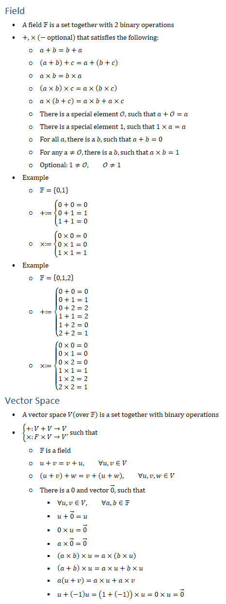 Field • A field F is a set together with 2 binary operations • +, × (− optional) that satisfies the following: ○ a+b=b+a ○ (a+b)+c=a+(b+c) ○ a×b=b×a ○ (a×b)×c=a×(b×c) ○ a×(b+c)=a×b+a×c ○ There is a special element O, such that a+O=a ○ There is a special element 1, such that 1×a=a ○ For all a, there is a b, such that a+b=0 ○ For any a≠O, there is a b, such that a×b=1 ○ Optional:1≠O, O≠1 • Example ○ F={0,1} ○ +≔{█(0+0=0@0+1=1@1+1=0)┤ ○ ×≔{█(0×0=0@0×1=0@1×1=1)┤ • Example ○ F={0,1,2} ○ +≔{█(0+0=0@0+1=1@0+2=2@1+1=2@1+2=0@2+2=1)┤ ○ ×≔{█(0×0=0@0×1=0@0×2=0@1×1=1@1×2=2@2×2=1)┤ Vector Space • A vector space V(over F) is a set together with binary operations • {█(+:V+V→V@×:F×V→V)┤, such that ○ F is a field ○ u+v=v+u, ∀u,v∈V ○ (u+v)+w=v+(u+w), ∀u,v,w∈V ○ There is a 0 and vector 0 ⃗, such that § ∀u,v∈V, ∀a,b∈F § u+0 ⃗=u § 0×u=0 ⃗ § a×0 ⃗=0 ⃗ § (a×b)×u=a×(b×u) § (a+b)×u=a×u+b×u § a(u+v)=a×u+a×v § u+(−1)u=(1+(−1))×u=0×u=0 ⃗