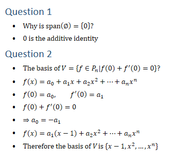 Question 1 • Why is span(∅)={0}? • 0 is the additive identity Question 2 • The basis of V={f∈P_n│f(0)+f^′ (0)=0}? • f(x)=a_0+a_1 x+a_2 x^2+…+a_n x^n • f(0)=a_0, f^′ (0)=a_1 • f(0)+f^′ (0)=0 • ⇒a_0=−a_1 • f(x)=a_1 (x−1)+a_2 x^2+…+a_n x^n • Therefore the basis of V is {x−1,x