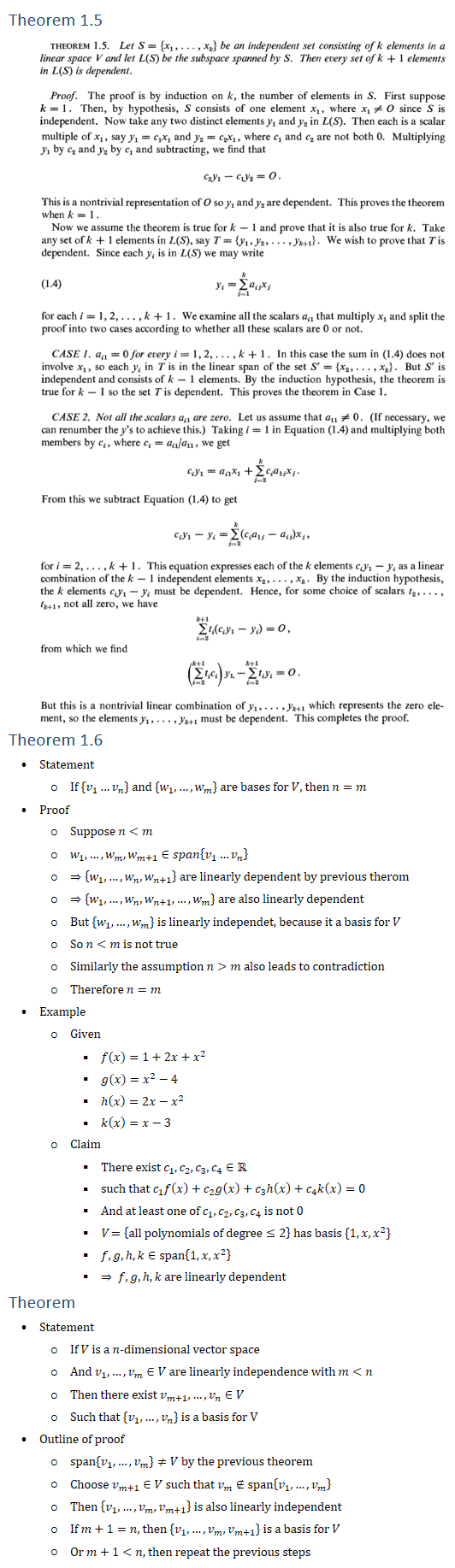 Theorem 1.5 Theorem 1.6 • Statement ○ If {v_1…v_n} and {w_1,…,w_m} are bases for V, then n=m • Proof ○ Suppose n<m ○ w_1,…,w_m,w_(m+1)∈span{v_1…v_n } ○ ⇒{w_1,…,w_n,w_(n+1) } are linearly dependent by previous therom ○ ⇒{w_1,…,w_n,w_(n+1),…,w_m } are also linearly dependent ○ But {w_1,…,w_m} is linearly independet, because it a basis for V ○ So n<m is not true ○ Similarly the assumption n>m also leads to contradiction ○ Therefore n=m • Example ○ Given § f(x)=1+2x+x^2 § g(x)=x^2−4 § h(x)=2x−x^2 § k(x)=x−3 ○ Claim § There exist c_1,c_2,c_3,c_4∈R § such that c_1 f(x)+c_2 g(x)+c_3 h(x)+c_4 k(x)=0 § And at least one of c_1,c_2,c_3,c_4 is not 0 § V ={all polynomials of degree≤2} has basis {1,x,x^2} § f,g,h,k∈span{1,x,x^2 } § ⇒ f,g,h,k are linearly dependent Theorem • Statement ○ If V is a n-dimensional vector space ○ And v_1,…,v_m∈V are linearly independence with m<n ○ Then there exist v_(m+1),…,v_n∈V ○ Such that {v_1,…,v_n} is a basis for V • Outline of proof ○ span{v_1,…,v_m }≠V by the previous theorem ○ Choose v_(m+1)∈V such that v_m∉span{v_1,…,v_m } ○ Then {v_1,…,v_m,v_(m+1) } is also linearly independent ○ If m+1=n, then {v_1,…,v_m,v_(m+1) } is a basis for V ○ Or m+1<n, then repeat the previous steps