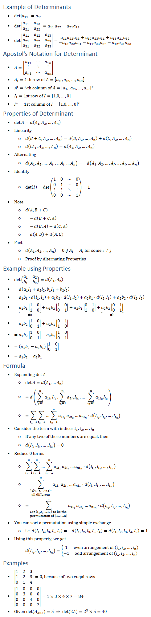 Example of Determinants • det〖|a_11 |=a_11 〗 • det〖|■8(a_11&a_12@a_21&a_22 )|=a_11 〗 a_22−a_21 a_12 • det|■8(a_11&a_12&a_13@a_21&a_22&a_23@a_31&a_32&a_33 )|=■8(a_11 a_22 a_33+a_12 a_23 a_31+a_13 a_21 a_32@−a_13 a_22 a_31−a_11 a_23 a_32−a_12 a_21 a_33 ) Apostol