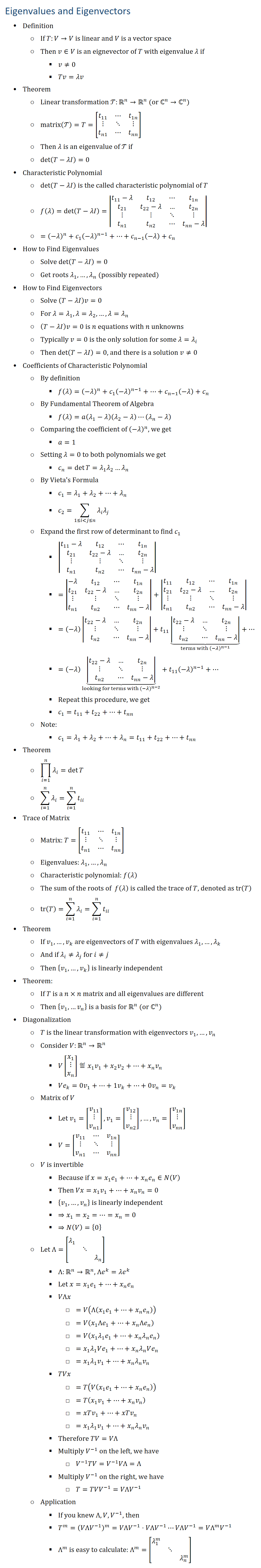 Eigenvalues and Eigenvectors • Definition ○ If T:V→V is linear and V is a vector space ○ Then v∈V is an eignevector of T with eigenvalue λ if § v≠0 § Tv=λv • Theorem ○ Linear transformation T:Rn→Rn (or ℂn→ℂn) ○ matrix(T)=T=[■8(t_11&⋯&t_1n@⋮&⋱&⋮@t_n1&⋯&t_nn )] ○ Then λ is an eigenvalue of T if ○ det(T−λI)=0 • Characteristic Polynomial ○ det(T−λI) is the called characteristic polynomial of T ○ f(λ)=det(T−λI)=|■8(t_11−λ&t_12&⋯&t_1n@t_21&t_22−λ&…&t_2n@⋮&⋮&⋱&⋮@t_n1&t_n2&⋯&t_nn−λ)| ○ =(−λ)^n+c_1 (−λ)^(n−1)+…+c_(n−1) (−λ)+c_n • How to Find Eigenvalues ○ Solve det(T−λI)=0 ○ Get roots λ_1,…,λ_n (possibly repeated) • How to Find Eigenvectors ○ Solve (T−λI)v=0 ○ For λ=λ_1,λ=λ_2,…,λ=λ_n ○ (T−λI)v=0 is n equations with n unknowns ○ Typically v=0 is the only solution for some λ=λ_i ○ Then det(T−λI)=0, and there is a solution v≠0 • Coefficients of Characteristic Polynomial ○ By definition § f(λ)=(−λ)^n+c_1 (−λ)^(n−1)+…+c_(n−1) (−λ)+c_n ○ By Fundamental Theorem of Algebra § f(λ)=a(λ_1−λ)(λ_2−λ)⋯(λ_n−λ) ○ Comparing the coefficient of (−λ)^n, we get § a=1 ○ Setting λ=0 to both polynomials we get § c_n=detT=λ_1 λ_2…λ_n ○ By Vieta