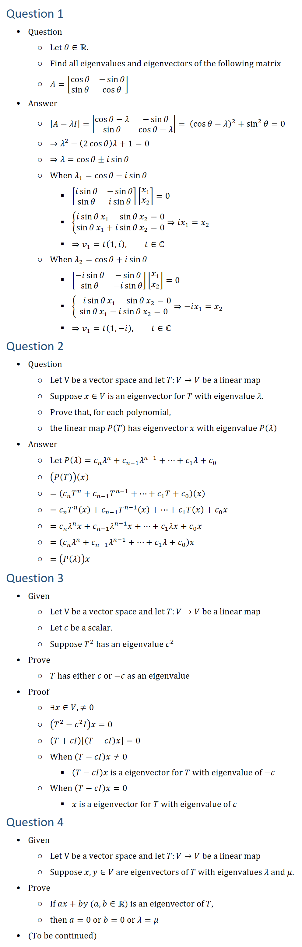 Question 1 • Question ○ Let θ∈R. ○ Find all eigenvalues and eigenvectors of the following matrix ○ A=[■8(cosθ&−sinθ@sinθ&cosθ )] • Answer ○ |A−λI|=|■8(cosθ−λ&−sinθ@sinθ&cos〖θ−λ〗 )|=\ (cosθ−λ)2+sin2θ=0 ○ ⇒λ^2−(2 cosθ )λ+1=0 ○ ⇒λ=cosθ±isinθ ○ When λ_1=cosθ−isinθ § [■8(i sinθ&−sinθ@sinθ&i sinθ )][█(x_1@x_2 )]=0 § {█(i sinθ x_1−sinθ x_2=0@sinθ x_1+i sinθ x_2=0)┤⇒ix_1=x_2 § ⇒v_1=t(1,i), t∈ℂ ○ When λ_2=cosθ+isinθ § [■8(−i sinθ&−sinθ@sinθ&−i sinθ )][█(x_1@x_2 )]=0 § {█(−i sinθ x_1−sinθ x_2=0@sinθ x_1−i sinθ x_2=0)┤⇒−ix_1=x_2 § ⇒v_1=t(1,−i), t∈ℂ Question 2 • Question ○ Let V be a vector space and let T:V→V be a linear map ○ Suppose x∈V is an eigenvector for T with eigenvalue λ. ○ Prove that, for each polynomial, ○ the linear map P(T) has eigenvector x with eigenvalue P(λ) • Answer ○ Let P(λ)=c_n λ^n+c_(n−1) λ^(n−1)+…+c_1 λ+c_0 ○ (P(T))(x) ○ =(c_n T^n+c_(n−1) T^(n−1)+…+c_1 T+c_0 )(x) ○ =c_n T^n (x)+c_(n−1) T^(n−1) (x)+…+c_1 T(x)+c_0 x ○ =c_n λ^n x+c_(n−1) λ^(n−1) x+…+c_1 λx+c_0 x ○ =(c_n λ^n+c_(n−1) λ^(n−1)+…+c_1 λ+c_0 )x ○ =(P(λ))x Question 3 • Given ○ Let V be a vector space and let T:V→V be a linear map ○ Let c be a scalar. ○ Suppose T^2 has an eigenvalue c^2 • Prove ○ T has either c or −c as an eigenvalue • Proof ○ ∃x∈V, ≠0 ○ (T2−c2 I)x=0 ○ (T+cI)[(T−cI)x]=0 ○ When (T−cI)x≠0 § (T−cI)x is a eigenvector for T with eigenvalue of −c ○ When (T−cI)x=0 § x is a eigenvector for T with eigenvalue of c Question 4 • Given ○ Let V be a vector space and let T:V→V be a linear map ○ Suppose x,y∈V are eigenvectors of T with eigenvalues λ and μ. • Prove ○ If ax+by (a,b∈R) is an eigenvector of T, ○ then a=0 or b=0 or λ=μ • Proof