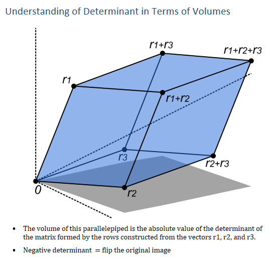 Understanding of Determinant in Terms of Volumes • The volume of this parallelepiped is the absolute value of the determinant of the matrix formed by the rows constructed from the vectors r1, r2, and r3. • Negative determinant = flip the original image