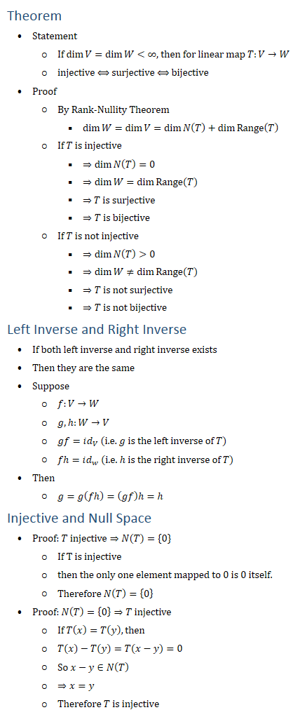 Theorem • Statement ○ If dimV=dimW<∞, then for linear map T:V→W ○ injective ⟺ surjective ⟺ bijective • Proof ○ By Rank-Nullity Theorem § dimW=dimV=dimN(T)+dimRange(T) ○ If T is injective § ⇒dimN(T)=0 § ⇒dimW=dimRange(T) § ⇒ T is surjective § ⇒T is bijective ○ If T is not injective § ⇒dimN(T)>0 § ⇒dimW≠dimRange(T) § ⇒T is not surjective § ⇒T is not bijective Left Inverse and Right Inverse • If both left inverse and right inverse exists • Then they are the same • Suppose ○ f:V→W ○ g,h:W→V ○ gf=id_V (i.e. g is the left inverse of T) ○ fh=id_w (i.e. h is the right inverse of T) • Then ○ g=g(fh=(gf)h=h Injective and Null Space • Proof: T injective⇒N(T)={0} ○ If T is injective ○ then the only one element mapped to 0 is 0 itself. ○ Therefore N(T)={0} • Proof: N(T)={0}⇒T injective ○ If T(x)=T(y), then ○ T(x)−T(y)=T(x−y)=0 ○ So x−y∈N(T) ○ ⇒x=y ○ Therefore T is injective