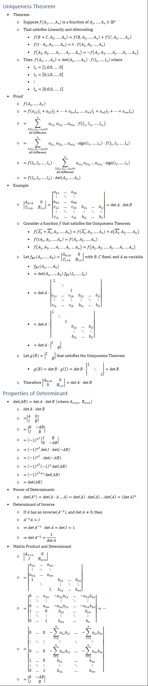 &…&c_lk&b_l1&…&b_ll )|=detA⋅detB ○ Consider a function f that satisfies the Uniqueness Theorem § f((A_1 ) ̅+(A_1 ) ̅ ̅,A_2,…,A_n )=f((A_1 ) ̅,A_2,…,A_n )+d((A_1 ) ̅ ̅,A_2,…,A_n ) § f(tA_1,A_2,…,A_n )=f(A_1,A_2,…,A_n ) § f(A_1,A_2,…,A_i,..,A_j,…A_n )=f(A_1,A_2,…,A_j,..,A_i,…A_n ) ○ Let f_BC (A_1,…,A_k )=|■8(A_(k×k)&0@C_(l×k)&B_(l×l) )| with B,C fixed, and A as variable § f_BC (A_1,…,A_k ) § =det(A_1,…,A_k ) f_BC (I_1,…,I_k ) § =detA⋅|■(1&&&&&@&⋱&&&&@&&1&&&