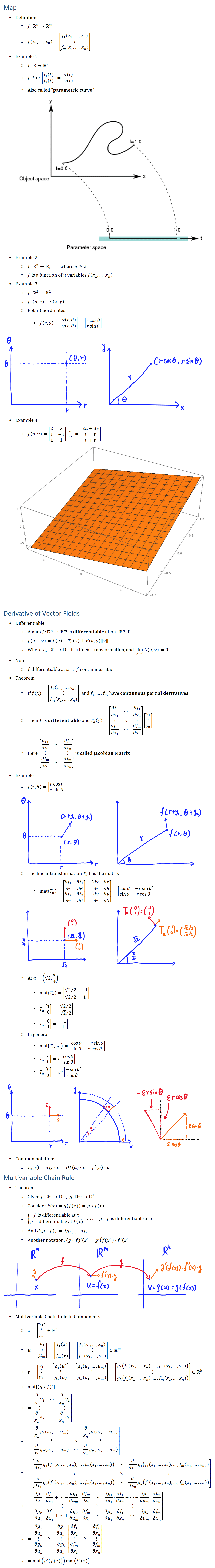 )] • Example ○ f(r,θ)=[█(r cosθ@r sinθ )] ○ The linear transformation T_a has the matrix § mat(T_a )=[■8((∂f_1)/∂r&(∂f_1)/∂θ@(∂f_2)/∂r&(∂f_2)/∂θ)]=[■8(∂x/∂r&∂x/∂θ@∂y/∂r&∂y/∂θ)]=[■8(cosθ&−r sinθ@sinθ&r cosθ )] ○ At a=(√2,π/4) § mat(T_a )=[■8(√2∕2&−1@√2∕2&1)] § T_a [█(1@0)]=[█(√2∕2@√2∕2)] § T_a [█(0@1)]=[█(−1@1)] ○ In general § mat(T_((r,θ) ) )=[■8(cosθ&−r sinθ@sinθ&r cosθ )] § T_a [█(ε@0)]=ε[█(cosθ@sinθ )] § T_a [█(0@ε)]=εr[█(−sinθ@cosθ )] • Common notations ○ T_a (v)=df_a⋅v=Df(a)⋅v=f^′ (a)⋅v • Jacobian Matrix ○ [■8((∂f_1)/(∂x_1 )&⋯&(∂f_1)/(∂x_n )@⋮&⋱&⋮@(∂f_m)/(∂x_1 )&⋯&(∂f_m)/(∂x_n ))] is called Jacobian Matrix • Chain Rule ○ Given f:Rn→Rm, g:Rm→Rk ○ Consider h(x)=g(f(x))=g∘f(x) ○ {█(f is differentiable at x@g is differentiable at f(x) )┤⇒h=g∘f is differentiable at x ○ And d(g∘f)_x=dg_f(x) ⋅df_x ○ Another notation: (g∘f)^′ (x)=g^′ (f(x))⋅f^′ (x) ○ In components § x=[█(x_1@⋮