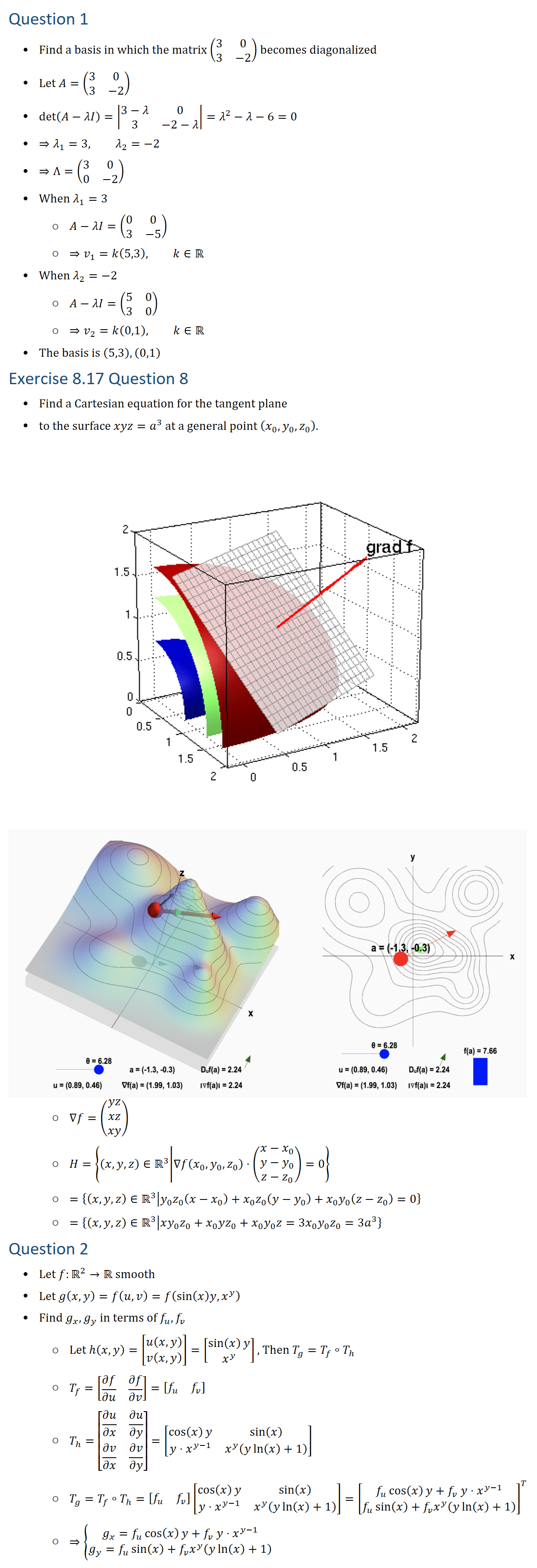 Question 1 • Find a basis in which the matrix (■8(3&0@3&−2)) becomes diagonalized • Let A=(■8(3&0@3&−2)) • det(A−λI)=|■8(3−λ&0@3&−2−λ)|=λ^2−λ−6=0 • ⇒λ_1=3, λ_2=−2 • ⇒Λ=(■8(3&0@0&−2)) • When λ_1=3 ○ A−λI=(■8(0&0@3&−5)) ○ ⇒v_1=k(5,3), k∈R • When λ_2=−2 ○ A−λI=(■8(5&0@3&0)) ○ ⇒v_2=k(0,1), k∈R • The basis is (5,3), (0,1) Exercise 8.17 Question 8 • Find a Cartesian equation for the tangent plane • to the surface xyz=a^3 at a general point (x_0,y_0,z_0 ). ○ ∇f=(█(yz@xz