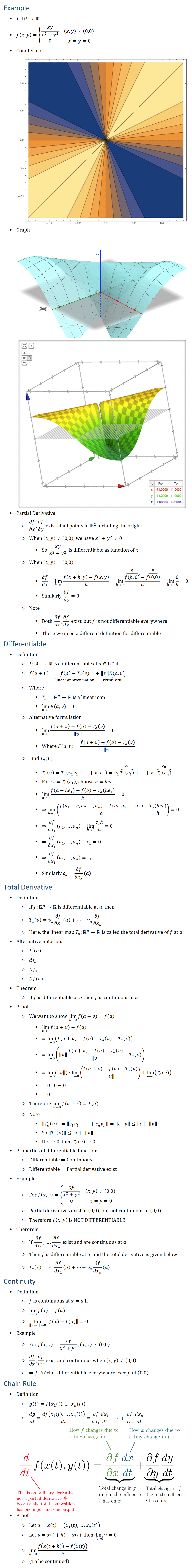 Example • f:R2→R • f(x,y)={■8(xy/(x2+y2 )&(x,y)≠(0,0) @0&x=y=0)┤ • Counterplot • Graph • Partial Derivative ○ ∂f/∂x,∂f/∂y exist at all points in R2 including the origin ○ When (x,y)≠(0,0), we have x2+y2≠0 § So xy/(x2+y2 ) is differentiable as function of x ○ When (x,y)=(0,0) § ∂f/∂x=lim_(h0)〖(f(x+hy)−f(x,y))/h=lim_(h0)〖(⏞(f(h0) )┴0−⏞(f(0,0) )┴0)/h=lim_(h0)〖0/h=0 § Similarly ∂f/∂y=0 ○ Note § Both ∂f/∂x,∂f/∂y exist, but f is not differentiable everywhere § There we need a different definition for differentiable Differentiable • Definition ○ f:Rn→R is a differentiable at a∈Rn if ○ f(a+v)=⏟(f(a)+T_a (v) )┬(linear approximation)+⏟(‖v‖E(a,v) )┬(error term) ○ Where § T_a=Rn→R is a linear map § lim_(v→0)E(a,v)=0 ○ Alternative formulation § lim_(v→0)〖(f(a+v)−f(a)−T_a (v))/‖v‖ 〗=0 § Where E(a,v)=(f(a+v)−f(a)−T_a (v))/‖v‖ ○ Find T_a (v) § T_a (v)=T_a (v_1 e_1+…+v_n e_n )=v_1 ⏞(T_a (e_1 ) )┴(c_1 )+…+v_n ⏞(T_a (e_n ) )┴(c_n ) § For c_1=T_a (e_1 ), choose v=he_1 § lim_(h0)〖(f(a+h�_1 )−f(a)−T_a (h�_1 ))/h=0 § ⇒lim_(h0)((f(a_1+ha_2,…,a_n )−f(a_1,a_2,…,a_n ))/h(T_a (h�_1 ))/h=0 § ⇒∂f/(∂x_1 ) (a_1,…,a_n )−lim_(h0)〖(c_1 h/h=0 § ⇒∂f/(∂x_1 ) (a_1,…,a_n )−c_1=0 § ⇒∂f/(∂x_1 ) (a_1,…,a_n )=c_1 § Similarly c_k=∂f/(∂x_k ) (a) Total Derivative • Definition ○ If f:Rn→R is differentiable at a, then ○ T_a (v)=v_1 ∂f/(∂x_1 ) (a)+…+v_n ∂f/(∂x_n ) ○ Here, the linear map T_a:Rn→R is called the total derivative of f at a • Alternative notations ○ f^′ (a) ○ df_a ○ Df_a ○ Df(a) • Theorem ○ If f is differentiable at a then f is continuous at a • Proof ○ We want to show lim_(h0)f(a+v)=f(a) § lim_(v→0)〖f(a+v)−f(a)〗 § =lim_(v→0)(f(a+v)−f(a)−T_a (v)+T_a (v)) § =lim_(v→0)(‖v‖ (f(a+v)−f(a)−T_a (v))/‖v‖ +T_a (v)) § =lim_(v→0)(‖v‖)⋅lim_(v→0)((f(a+v)−f(a)−T_a (v))/‖v‖ )+lim_(v→0)(T_a (v)) § =0⋅0+0 § =0 ○ Therefore lim_(h0)f(a+v)=f(a) ○ Note § ‖T_a (v)‖=‖c_1 v_1+…+c_n v_n ‖=‖c⋅v‖≤‖c‖⋅‖v‖ § So ‖T_a (v)‖≤‖c‖⋅‖v‖ § If v→0, then T_a (v)→0 • Properties of differentiable functions ○ Differentiable ⇒ Continuous ○ Differentiable ⇒ Partial derivative exist • Example ○ For f(x,y)={■8(xy/(x2+y2 )&(x,y)≠(0,0) @0&x=y=0)┤ ○ Partial derivatives exist at (0,0), but not continuous at (0,0) ○ Therefore f(x,y) is NOT DIFFERENTIABLE • Therorem ○ If ∂f/(∂x_1 ),…,∂f/(∂x_n ) exist and are continuous at a ○ Then f is differentiable at a, and the total derivative is given below ○ T_a (v)=v_1 ∂f/(∂x_1 ) (a)+…+v_n ∂f/(∂x_n ) (a) Continuity • Definition ○ f is contunuous at x=a if ○ lim_(x→0)f(x)=f(a) ○ lim_(‖x−a‖→0)‖f(x)−f(a)‖=0 • Example ○ For f(x,y)=xy/(x2+y2 ), (x,y)≠(0,0) ○ ∂f/∂x,∂f/∂y exist and continuous when (x,y)≠(0,0) ○ ⇒f Fréchet differentiable everywhere except at (0,0) Chain Rule • Definition ○ g(t)=f(x_1 (t),…,x_n (t)) ○ dg/dt=df(x_1 (t),…,x_n (t))/dt=∂f/(∂x_1 ) (dx_1)/dt+…+∂f/(∂x_n ) (dx_n)/dt • Proof ○ Let a=x(t)=(x_1 (t),…,x_n (t)) ○ Let v=x(t+h−x(t), then lim_(h0)v=0 ○ lim_(h0)〖(f(x(t+h)−f(x(t)))/h ○ (To be continued)