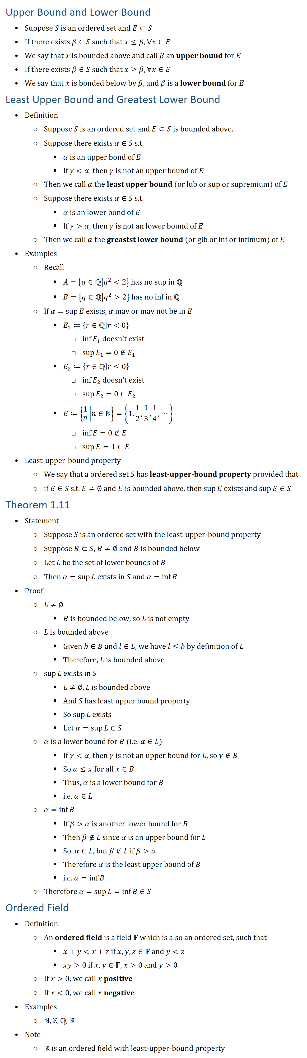 Upper Bound and Lower Bound • Suppose S is an ordered set and E⊂S • If there exists β∈S such that x≤β, ∀x∈E • We say that x is bounded above and call β an upper bound for E • If there exists β∈S such that x≥β, ∀x∈E • We say that x is bonded below by β, and β is a lower bound for E Least Upper Bound and Greatest Lower Bound • Definition ○ Suppose S is an ordered set and E⊂S is bounded above. ○ Suppose there exists α∈S s.t. § α is an upper bond of E § If γ α, then γ is not an upper bound of E ○ Then we call α the least upper bound (or lub or sup or supremium) of E ○ Suppose there exists α∈S s.t. § α is an lower bond of E § If γ α, then γ is not an lower bound of E ○ Then we call α the greastst lower bound (or glb or inf or infimum) of E • Examples ○ Recall § A={q∈Qq^2 2} has no sup in Q § B={q∈Qq^2 2} has no inf in Q ○ If α=supE exists, α may or may not be in E § E_1≔{r∈Qr 0} □ inf〖E_1 〗 doesn t exist □ sup〖E_1 〗=0∉E_1 § E_2≔{r∈Qr≤0} □ inf〖E_2 〗 doesn t exist □ sup〖E_2 〗=0∈E_2 § E≔{1/n│n∈N={1, 1/2,1/3,1/4,⋯} □ infE=0∉E □ supE=1∈E • Least-upper-bound property ○ We say that a ordered set S has least-upper-bound property provided that ○ if E∈S s.t. E≠∅ and E is bounded above, then supE exists and supE∈S Theorem 1.11 • Statement ○ Suppose S is an ordered set with the least-upper-bound property ○ Suppose B⊂S, B≠∅ and B is bounded below ○ Let L be the set of lower bounds of B ○ Then α=supL exists in S and α=infB • Proof ○ L≠∅ § B is bounded below, so L is not empty ○ L is bounded above § Given b∈B and l∈L, we have l≤b by definition of L § Therefore, L is bounded above ○ supL exists in S § L≠∅, L is bounded above § And S has least upper bound property § So supL exists § Let α=supL∈S ○ α is a lower bound for B (i.e. α∈L) § If γ α, then γ is not an upper bound for L, so γ∉B § So α≤x for all x∈B § Thus, α is a lower bound for B § i.e. α∈L ○ α=infB § If β α is another lower bound for B § Then β∉L since α is an upper bound for L § So, α∈L, but β∉L if β α § Therefore α is the least upper bound of B § i.e. α=infB ○ Therefore α=supL=infB∈S Ordered Field • Definition ○ An ordered field is a field F which is also an ordered set, such that § x+y x+z if x,y,z∈F and y z § xy 0 if x,y∈F, x 0 and y 0 ○ If x 0, we call x positive ○ If x 0, we call x negative • Examples ○ N,Z,Q, R • Note ○ R is an ordered field with least-upper-bound property