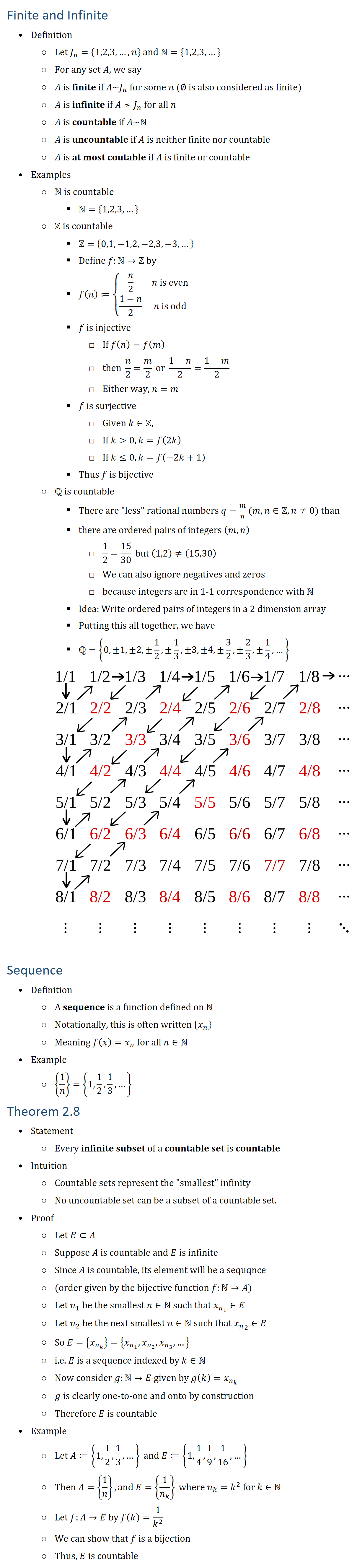 Finite and Countable • Definition ○ Let J_n={1,2,3,…,n} and N={1,2,3,…} ○ For any set A, we say ○ A is finite if A~J_n for some n (∅~J_0 so ∅ is finite) ○ A is infinite if A≁J_n for all n ○ A is countable if A~N ○ A is uncountable if A is neither finite nor countable ○ A is at most coutable if A is finite or countable • Examples ○ N is clearly countable § N={1,2,3,…} ○ Z is countable § Z={0,1,−1,2,−2,3,−3,…} § Define f:N→Z by § f(n)≔{■8(n/2&n is even@(1−n)/2&n is odd)┤ § f is injective □ If f(n)=f(m) □ then n/2=m/2 or (1−n)/2=(1−m)/2 □ Either way, n=m § f is surjective □ Given k∈Z, □ If k0, k=f(2k) □ If k≤0, k=f(−2k+1) § Thus f is bijective ○ Q is countable § There are “less” rational numbers q=m/n (m,n∈Z,n≠0) than § there are ordered pairs of integers (m,n) □ 1/2=15/30 but (1,2)≠(15,30) □ We can also ignore negatives and zeros □ because integers are in 1-1 correspondence with N § Idea: Write ordered pairs of integers in a 2 dimension array § Putting this all together, we have § Q={0,±1,±2,±1/2,±1/3,±3,±4,±3/2,±2/3,±1/4,…} Sequence • Definition ○ A sequence is a function defined on N ○ Notationally, this is often written {x_n } ○ Meaning f(x)=x_n for all n∈N • Example ○ {1/n}={1, 1/2,1/3,…} Theorem 2.8 • Statement ○ Every infinite subset of a countable set is countable • Proof ○ Suppose E⊂A, A is countable and E is infinite ○ Since A is countable, its element will be a sequqnce ○ (order given by the bijective function f:N→A) ○ So, A={x_n } as a set ○ Let n_1 be the smallest n∈N such that x_(n_1 )∈E ○ Let n_2 be the next smallest n∈N such that 〖x_n〗_2∈E ○ So E={x_(n_k ) }={x_(n_1 ),x_(n_2 ),x_(n_3 ),…} (A sequence indexed by k∈N) ○ Now consider g:N→E given by g(k)=x_(n_k ) ○ g is clearly one-to-one and onto by construction ○ So E is countable • Example ○ If A={1, 1/2,1/3,…} and E={1, 1/4,1/9,1/16} ○ Then A={1/n}={1, 1/2,1/3,…} ○ and E={1/n_k }={1, 1/4,1/9,1/16} where n_k=k^2 for k∈N ○ f:A→E by f(k)=1/k^2