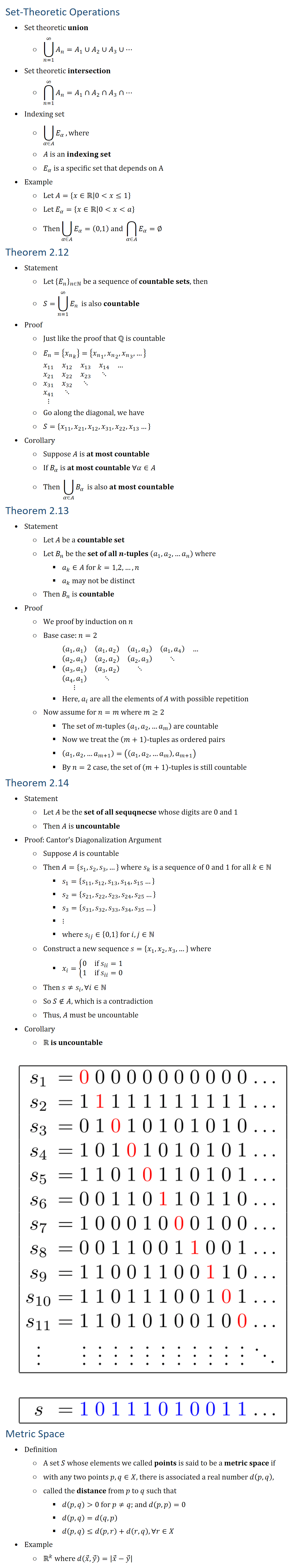 Set-Theoretic Operations • Set theoretic union ○ ⋃24_(n=1)^∞▒A_n =A_1∪A_2∪A_3∪⋯ • Set theoretic intersection ○ ⋂24_(n=1)^∞▒A_n =A_1∩A_2∩A_3∩⋯ • Indexing set ○ ⋃8_(α∈A)▒E_α , where ○ A is an indexing set ○ E_α is a specific set that depends on A • Example ○ Let A={x∈R0x≤1} ○ Let E_α={x∈R0xa} ○ Then⋃8_(α∈A)▒E_α =(0,1) and ⋂8_(α∈A)▒E_α =∅ Theorem 2.12 • Statement ○ Let {E_n }_(n∈N be a sequence of countable sets, then ○ S=⋃24_(n=1)^∞▒E_n is also countable • Proof ○ Just like the proof that Q is countable ○ E_n={〖x_n〗_k }={〖x_n〗_1,〖x_n〗_2,〖x_n〗_3,…} ○ ■(x_11&x_12&x_13&x_14&…&@x_21&x_22&x_23&⋱&&@x_31&x_32&⋱&&&@x_41&⋱&&&&@⋮&&&&&) ○ Go along the diagonal, we have ○ S={x_11,x_21,x_12,x_31,x_22,x_13…} • Corollary ○ Suppose A is at most countable ○ If for α∈A, B_α is at most countable, then ○ T=⋃8_(α∈A)▒B_α is also at most countable Theorem 2.13 • Statement ○ Let A be a countable set ○ Let B_n be the set of all n-tuples (a_1,a_2,…a_n ) where a_k∈A for 1≤k≤n ○ And a_k may not be distinct, then B_n is countable • Proof ○ We proof by induction on n ○ Base case: n=2 § ■((a_1,a_1 )&(a_1,a_2 )&(a_1,a_3 )&(a_1,a_4 )&…&@(a_2,a_1 )&(a_2,a_2 )&(a_2,a_3 )&⋱&&@(a_3,a_1 )&(a_3,a_2 )&⋱&&&@(a_4,a_1 )&⋱&&&&@⋮&&&&&) § Here a_i are all the elements of A with possible repetition ○ Now assume for n=m (m≥2) § The set of m-tuples (a_1,a_2,…a_m ) are countable § Now we treat the (m+1)\tuples as ordered pairs § (a_1,a_2,…a_(m+1) )=((a_1,a_2,…a_m ),a_(m+1) ) § By n=2 case, the set of (m+1)\tuples is still countable Theorem 2.14 • Statement ○ Let A be the set of all sequqnecse whose digits are 0 and 1 ○ Then A is uncountable • Proof: Cantor
