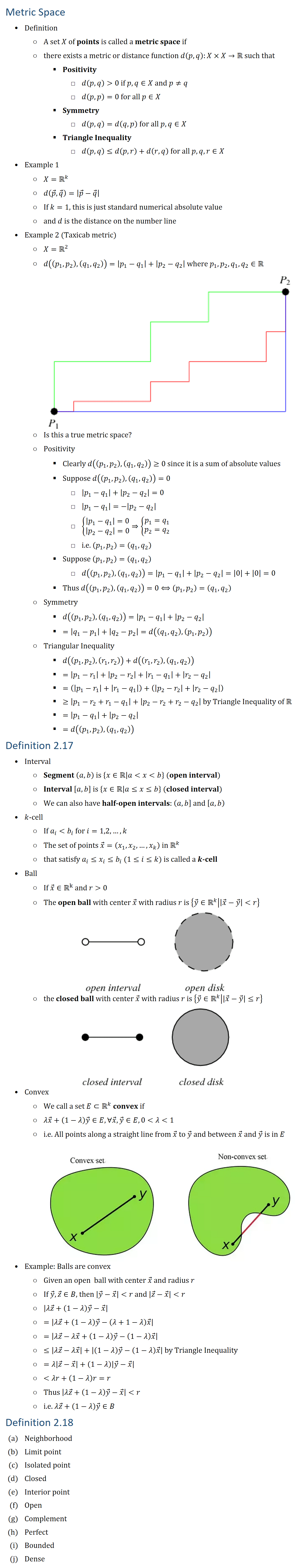 Metric Space • Definition ○ A set X of points is called a metric space if ○ there exists a metric or distance function d(p,q):X×X→R such that § Positivity □ d(p,q)0 if p,q∈X and p≠q □ d(p,p)=0 for all p∈X § Symmetry □ d(p,q)=d(q,p) for all p,q∈X § Triangle Inequality □ d(p,q)≤d(p,r)+d(r,q) for all p,q,r∈X • Example 1 ○ X=Rk ○ d(p ⃗,q ⃗ )=|p ⃗−q ⃗ | ○ If k=1, this is just standard numerical absolute value ○ and d is distance on the number line • Example 2 (Taxicab metric) ○ X=R2 ○ d((p_1,p_2 ),(q_1,q_2 ))=|p_1−q_1 |+|p_2−q_2 | where p_1,p_2,q_1,q_2∈R ○ Is this a true metric space? ○ Positivity § Clearly d((p_1,p_2 ),(q_1,q_2 ))≥0 since it is a sum of absolute values § Suppose d((p_1,p_2 ),(q_1,q_2 ))=0 □ |p_1−q_1 |+|p_2−q_2 |=0 □ |p_1−q_1 |=−|p_2−q_2 | □ {█(|p_1−q_1 |=0@|p_2−q_2 |=0)┤⇒{█(p_1=q_1@p_2=q_2 )┤ □ i.e. (p_1,p_2 )=(q_1,q_2 ) § Suppose (p_1,p_2 )=(q_1,q_2 ) □ d((p_1,p_2 ),(q_1,q_2 ))=|p_1−q_1 |+|p_2−q_2 |=|0|+|0|=0 § Thus d((p_1,p_2 ),(q_1,q_2 ))=0 iff (p_1,p_2 )=(q_1,q_2 ) ○ Symmetry § d((p_1,p_2 ),(q_1,q_2 ))=|p_1−q_1 |+|p_2−q_2 | § =|q_1−p_1 |+|q_2−p_2 |=d((q_1,q_2 ),(p_1,p_2 )) ○ Triangular Inequality § d((p_1,p_2 ),(r_1,r_2 ))+d((r_1,r_2 ),(q_1,q_2 )) § =|p_1−r_1 |+|p_2−r_2 |+|r_1−q_1 |+|r_2−q_2 | § =(|p_1−r_1 |+|r_1−q_1 |)+(|p_2−r_2 |+|r_2−q_2 |) § ≥|p_1−r_2+r_1−q_1 |+|p_2−r_2+r_2−q_2 | by Triangle Inequality of R § =|p_1−q_1 |+|p_2−q_2 | § =d((p_1,p_2 ),(q_1,q_2 )) Definition 2.17 • Interval ○ Segment (a,b) is {x∈Raxb} (open interval) ○ Interval [a,b] is {x∈Ra≤x≤b} (closed interval) ○ We can also have half-open intervals: (a,b] and [a,b) • k-cell ○ If a_ib_i for i=1,2,…,k ○ The set of points x ⃗=(x_1,x_2,…,x_k ) in Rk ○ that satisfy a_i≤x_i≤b_i (1≤i≤k) is called a k-cell • Ball ○ If x ⃗∈Rk and r0 ○ the open ball with center x ⃗ with radius r is {y ⃗∈Rk│|x ⃗−y ⃗ |r} ○ the closed ball with center x ⃗ with radius r is {y ⃗∈Rk│|x ⃗−y ⃗ |≤r} • Convex ○ We call a set E⊂Rk convex if ○ λx ⃗+(1−λ) y ⃗∈E, ∀x ⃗,y ⃗∈E, 0λ1 ○ i.e. All points along a straight line from x ⃗ to y ⃗ and between x ⃗ and y ⃗ is in E • Example: Balls are convex ○ Given an open ball with center x ⃗ and radius r ○ If y ⃗,z ⃗∈B, then |y ⃗−x ⃗ |r and |z ⃗−x ⃗ |r ○ |λz ⃗+(1−λ) y ⃗−x ⃗ | ○ =|λz ⃗+(1−λ) y ⃗−(λ+1−λ) x ⃗ | ○ =|λz ⃗−λx ⃗+(1−λ) y ⃗−(1−λ) x ⃗ | ○ ≤|λz ⃗−λx ⃗ |+|(1−λ) y ⃗−(1−λ) x ⃗ | by Triangle Inequality ○ =λ|z ⃗−x ⃗ |+(1−λ)|y ⃗−x ⃗ | ○ λr+(1−λ)r=r ○ Thus |λz ⃗+(1−λ) y ⃗−x ⃗ |r ○ i.e. λz ⃗+(1−λ) y ⃗∈B Definition 2.18 (a) Neighborhood (b) Limit point (c) Isolated point (d) Closed (e) Interior point (f) Open (g) Complement (h) Perfect (i) Bounded (j) Dense